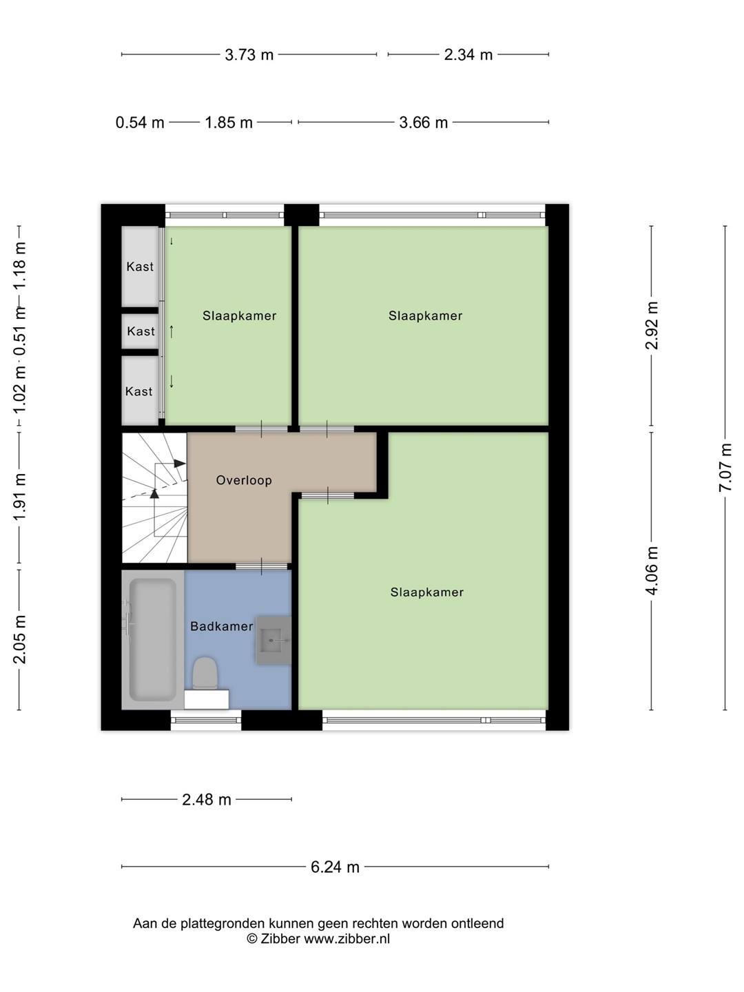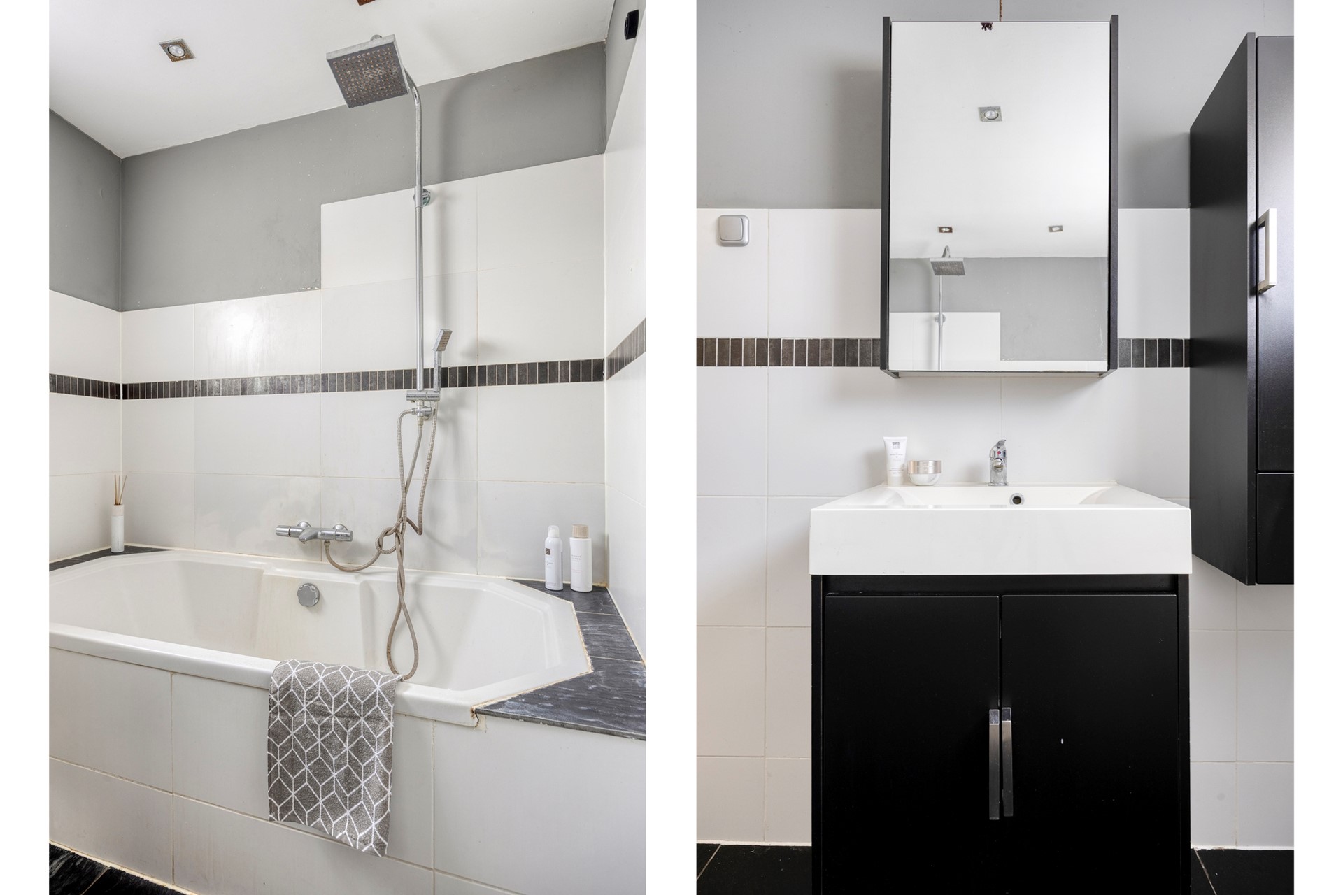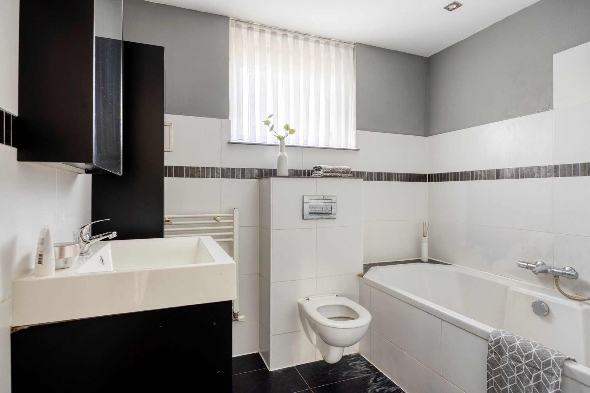 De overloop biedt toegang tot de drie slaapkamers met vloerbedekking en de badkamer. De badkamer is uitgerust met een ligbad, toilet en wastafel. Er is een raam aanwezig voor natuurlijke ventilatie.