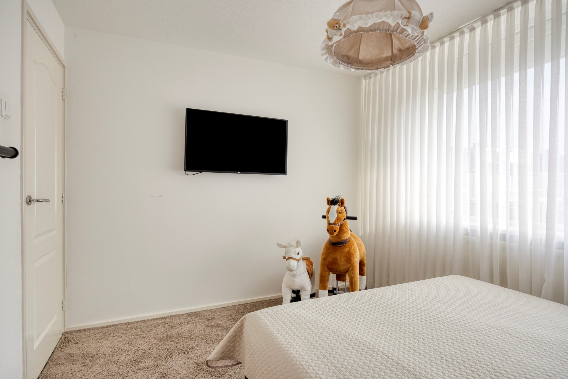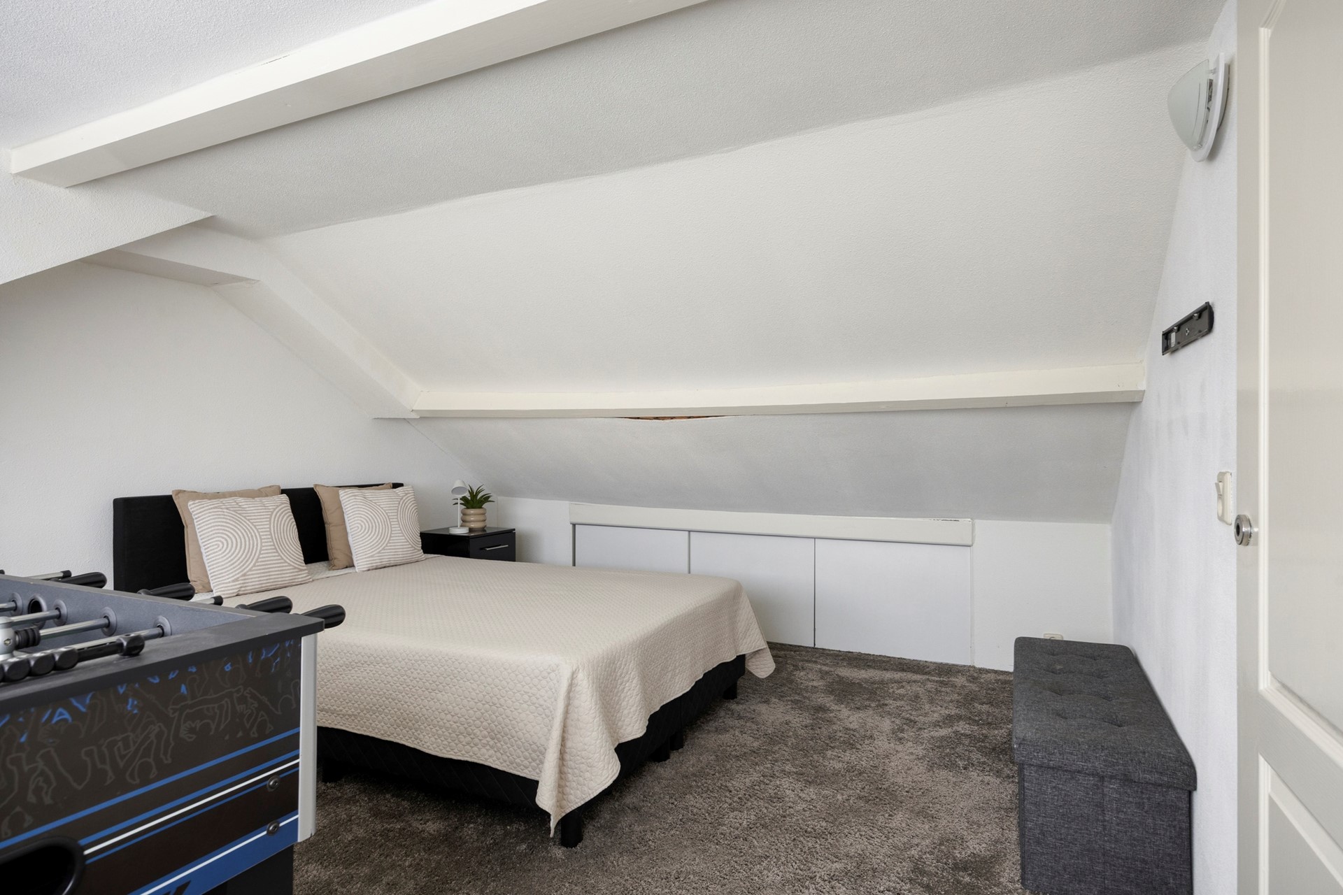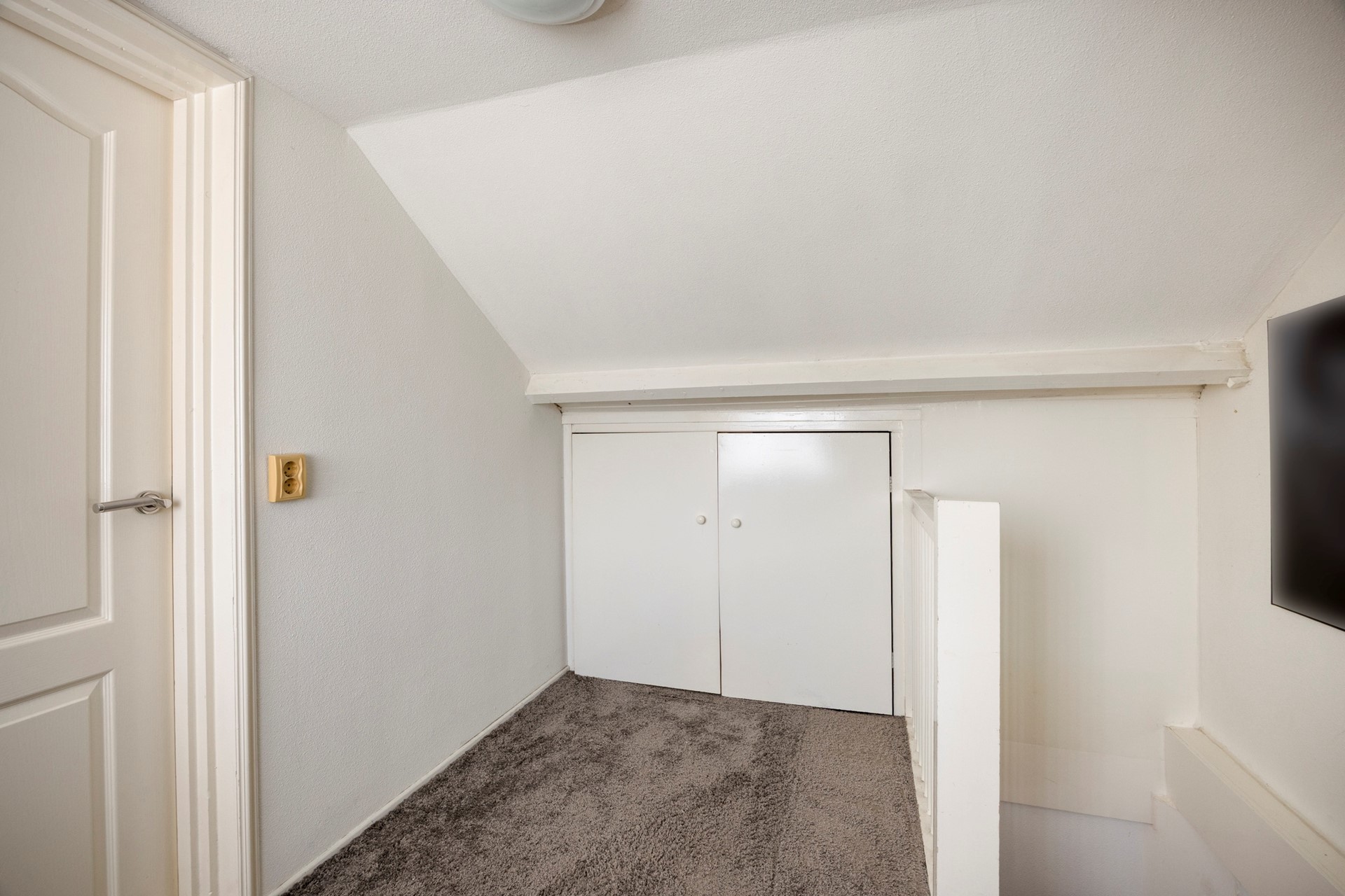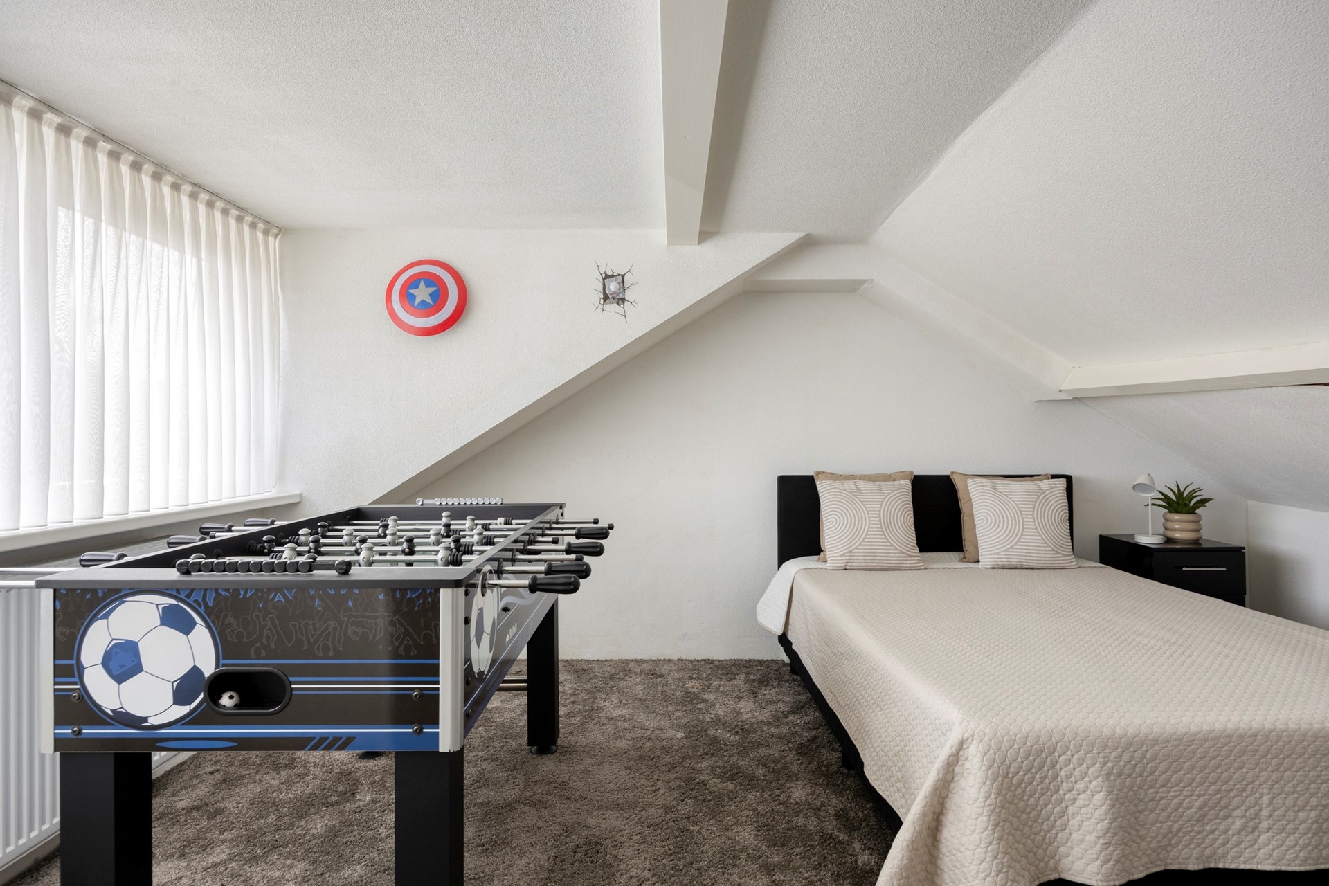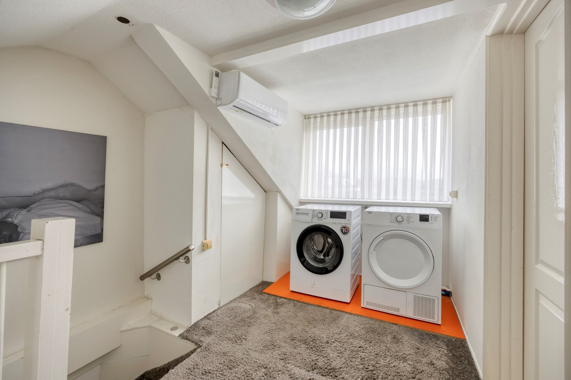 De zolderverdieping is via een vaste trap bereikbaar en voorzien van een dakkapel (over de gehele breedte) waardoor er veel lichtinval en extra leefruimte is gecreëerd. Hier bevinden zich de voorzolder met aansluiting voor de wasmachine en droger en de CV ketel hangt hier en de tweede airco. De vierde slaapkamer is van een prima formaat en ook voorzien van vloerbedekking. De knieschotten bieden extra bergruimte.