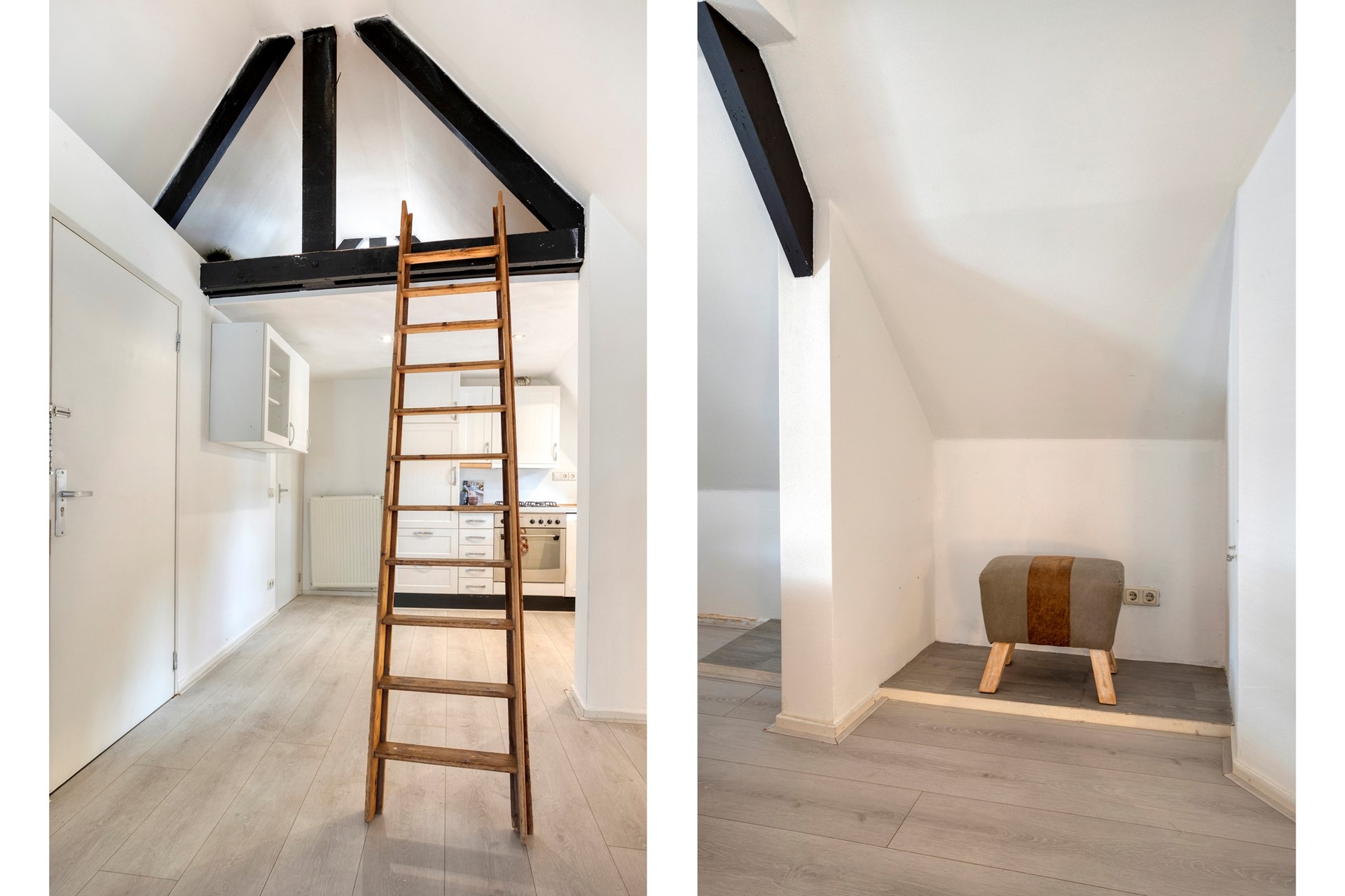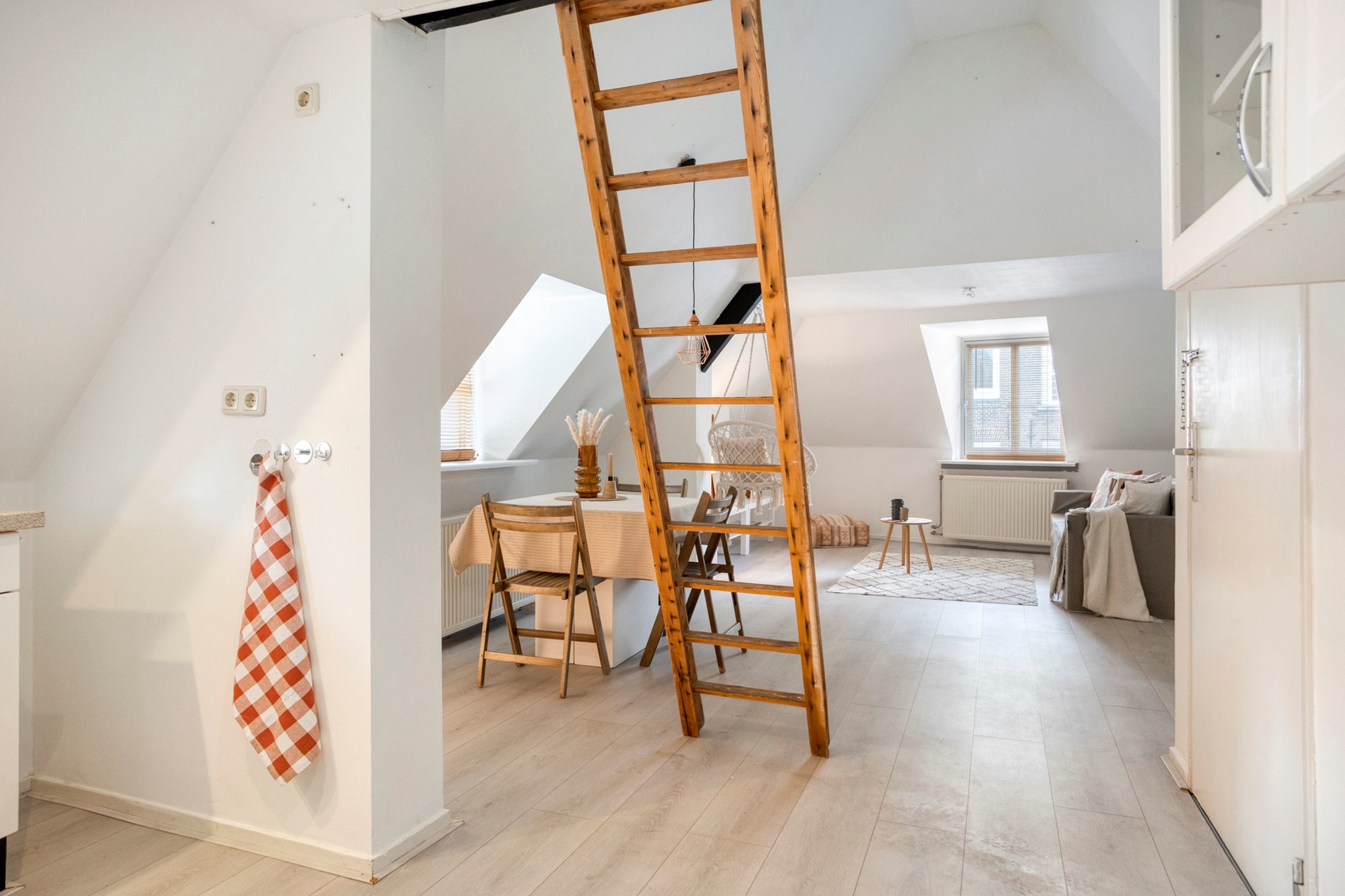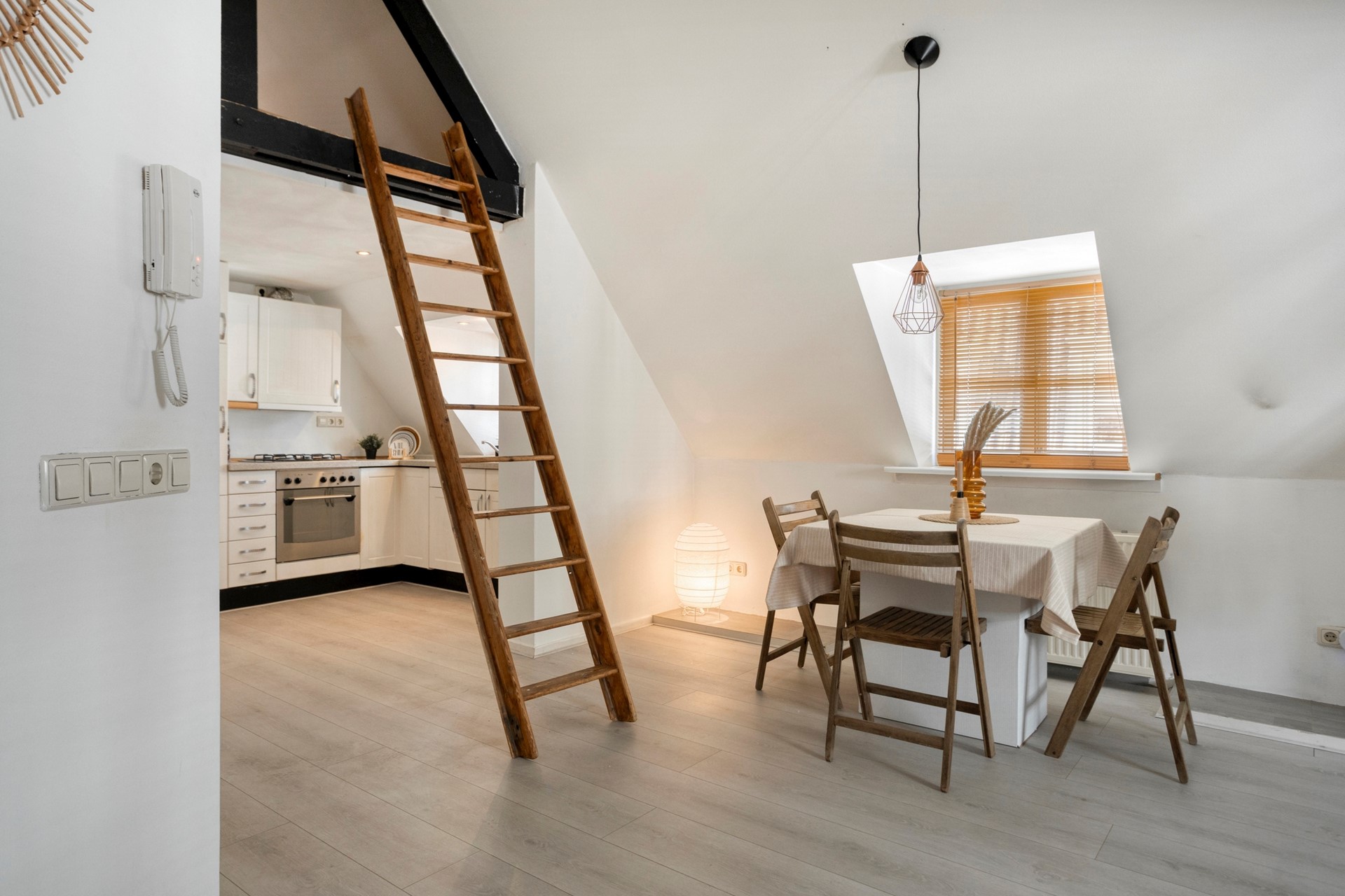 Eerst een klein voorportaal met de meterkast en garderobe. Vanuit hier loop je door naar de leefruimte. De karakteristieke dakramen aan de voorzijde en zijkant van het pand zorgen voor het lichtinval en een prettig uitzicht. De ruimte is verder voorzien van een laminaatvloer die doorloopt in de rest van de woning. De open keuken is uitgerust met een gaskookplaat met afzuiging, koelkast en oven. Er is een vide in de woonkamer die eventueel gebruikt kan worden als 2e slaapplaats.
