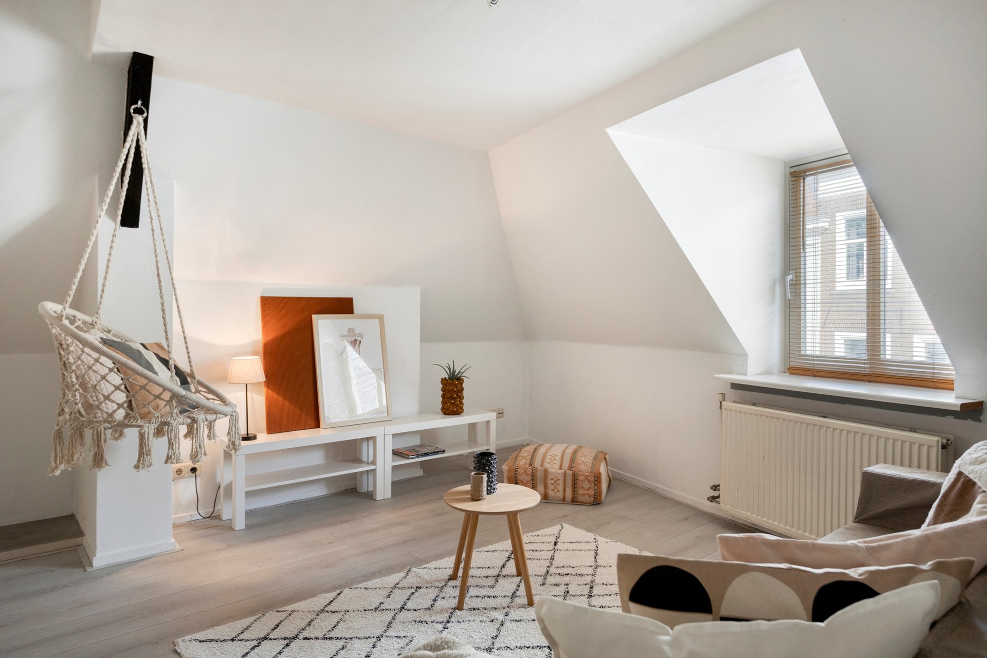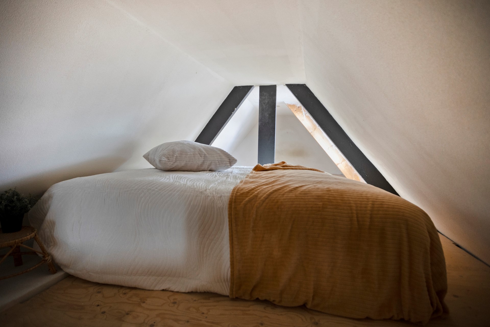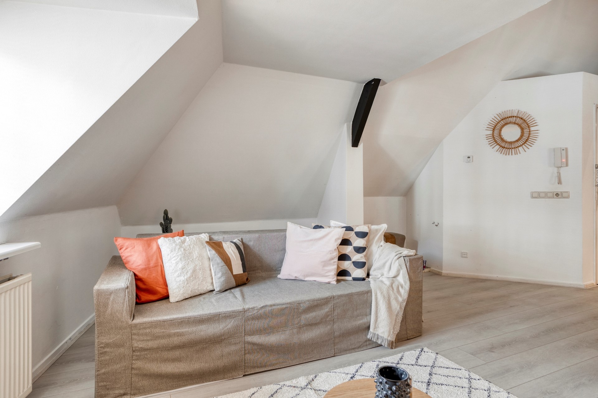 Eerst een klein voorportaal met de meterkast en garderobe. Vanuit hier loop je door naar de leefruimte. De karakteristieke dakramen aan de voorzijde en zijkant van het pand zorgen voor het lichtinval en een prettig uitzicht. De ruimte is verder voorzien van een laminaatvloer die doorloopt in de rest van de woning. De open keuken is uitgerust met een gaskookplaat met afzuiging, koelkast en oven. Er is een vide in de woonkamer die eventueel gebruikt kan worden als 2e slaapplaats.