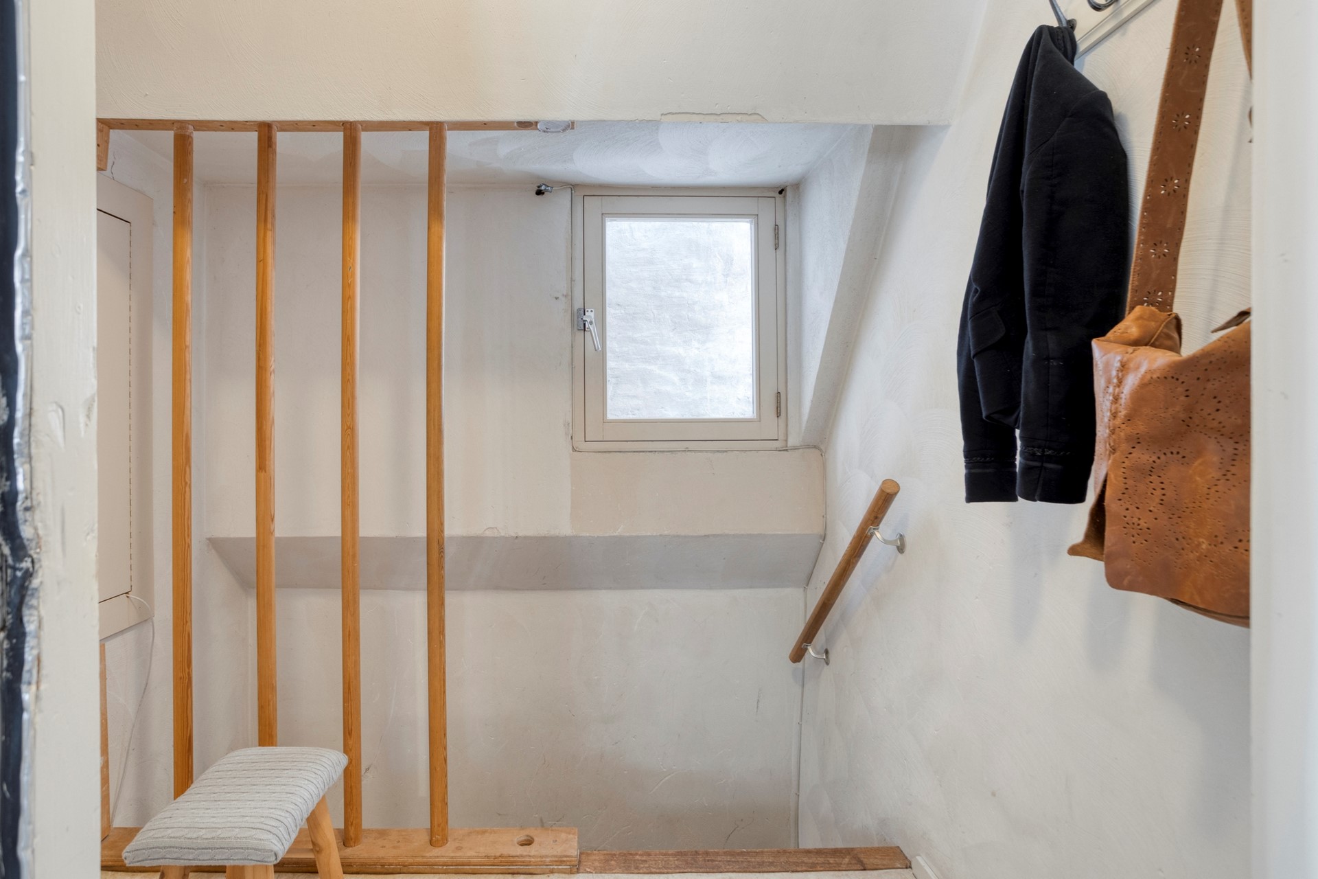 Begane grond: Achter de voordeur bevindt zich de lange trapopgang naar het appartement op de eerste en de tweede verdieping.