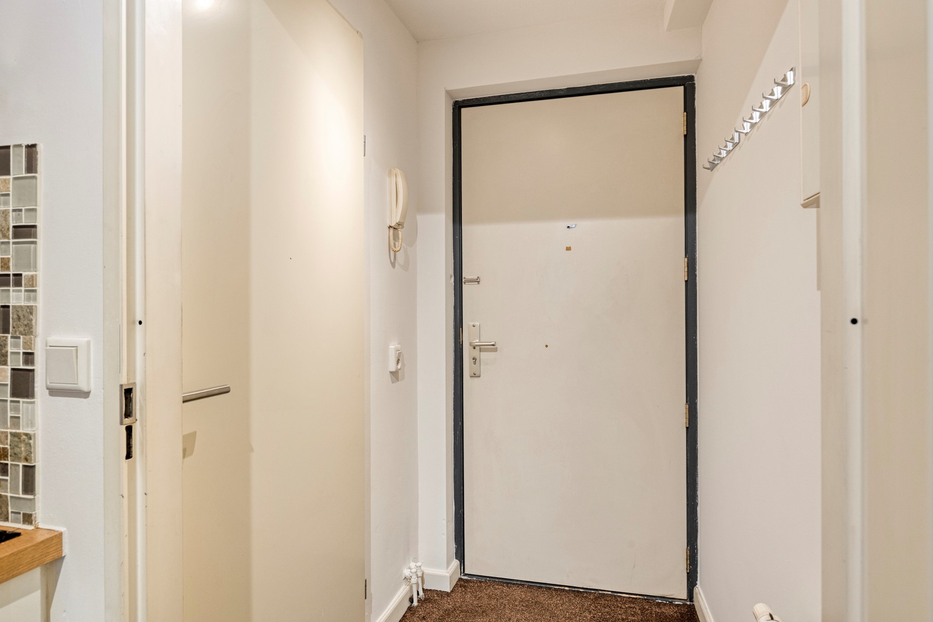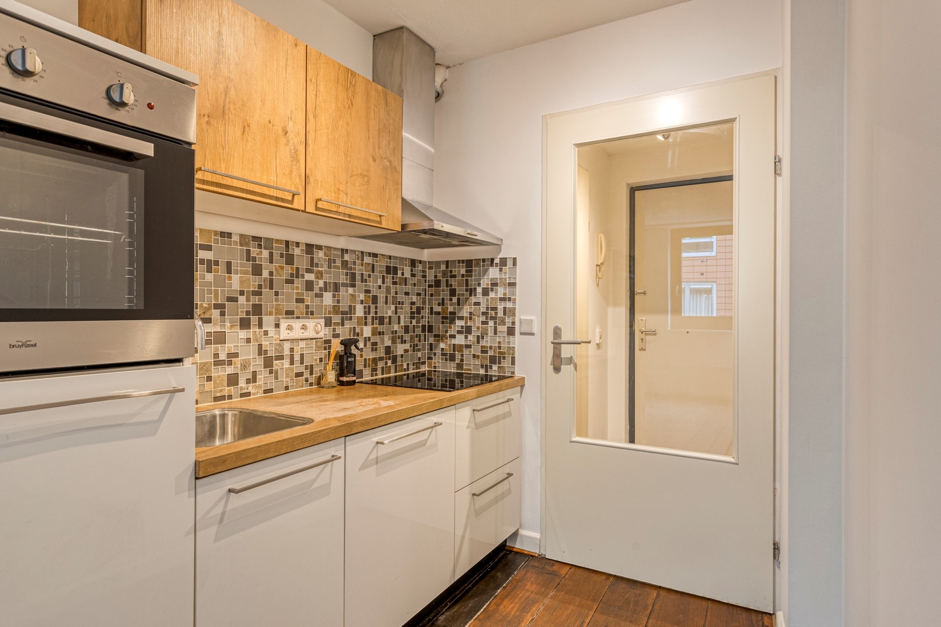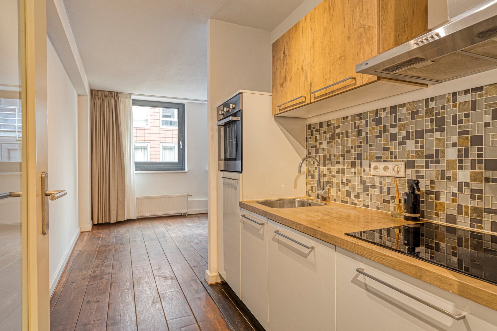 Binnenkomst in de hal die toegang geeft tot de badkamer en de keuken/woonkamer. De woonkamer beschikt over een houten vloer en twee grote raampartijen met draai/kiep functie. Dit zorgt voor een fijn, ruimtelijk gevoel en extra daglichttoetreding. De keuken is voorzien van een keukenmeubel met diverse inbouwapparatuur, waaronder een koelkast, inductiekookplaat met afzuigkap, oven en een vaatwasser.