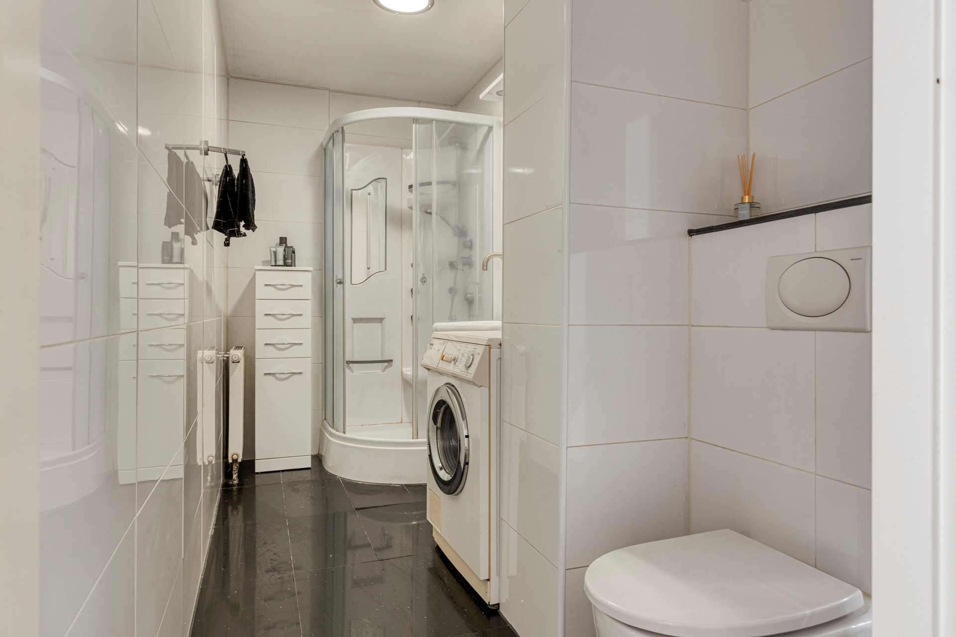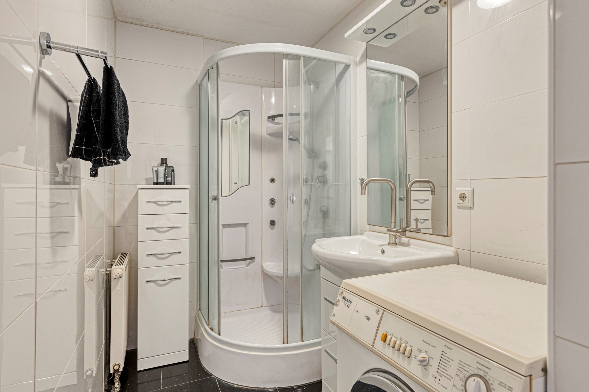 De slaapruimte is middels gordijnen af te sluiten. De badkamer is compleet met een douchecabine, toilet, wastafel en de aansluiting voor de wasmachine .