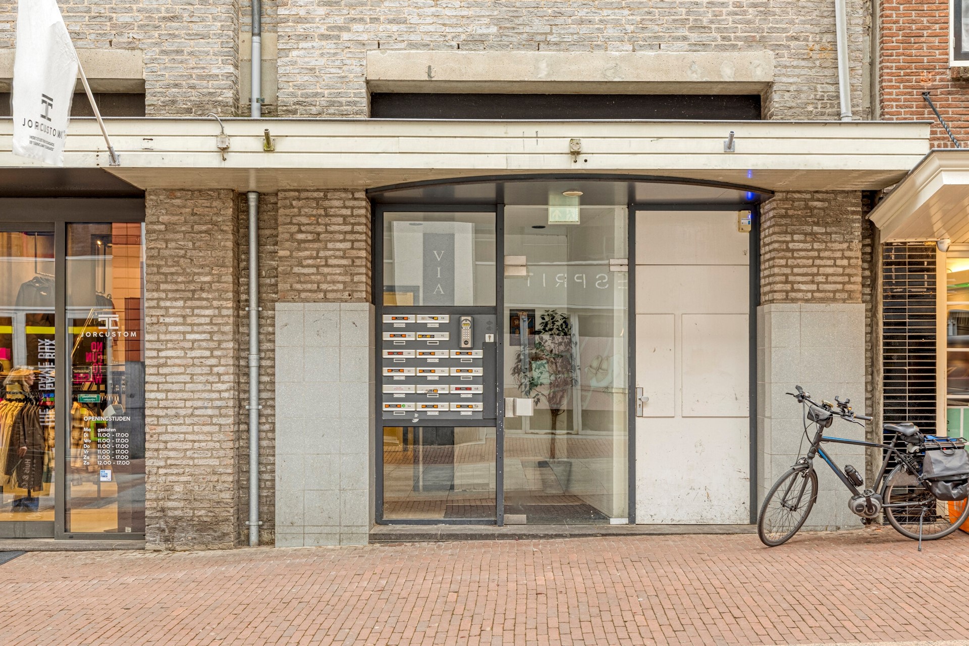 Gezamenlijke entree/hal met brievenbussen en intercominstallatie en aansluitend de lift en de trapopgang naar de appartementen. De fietsenberging is naast de hoofdingang gelegen.
