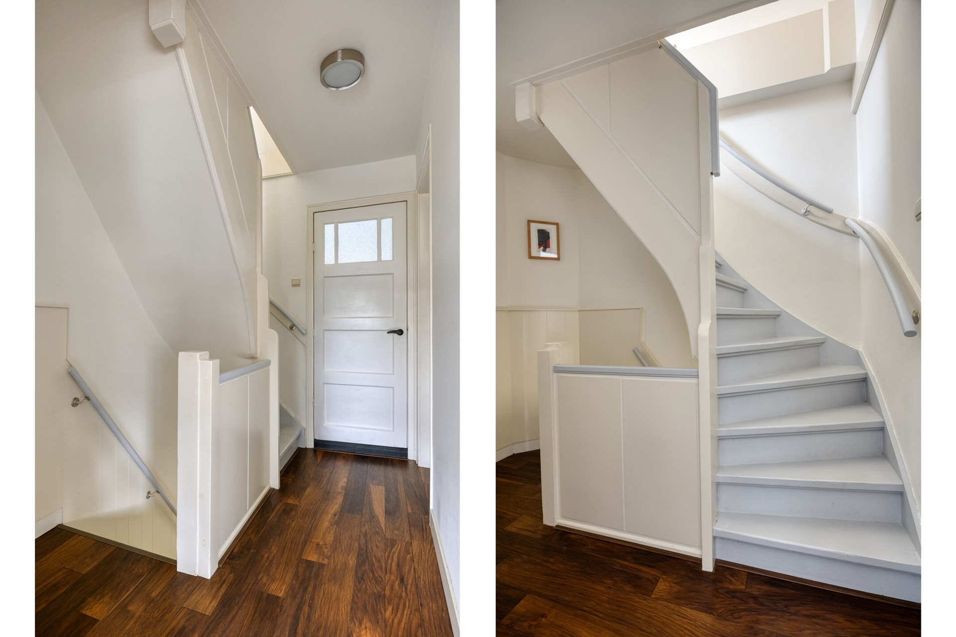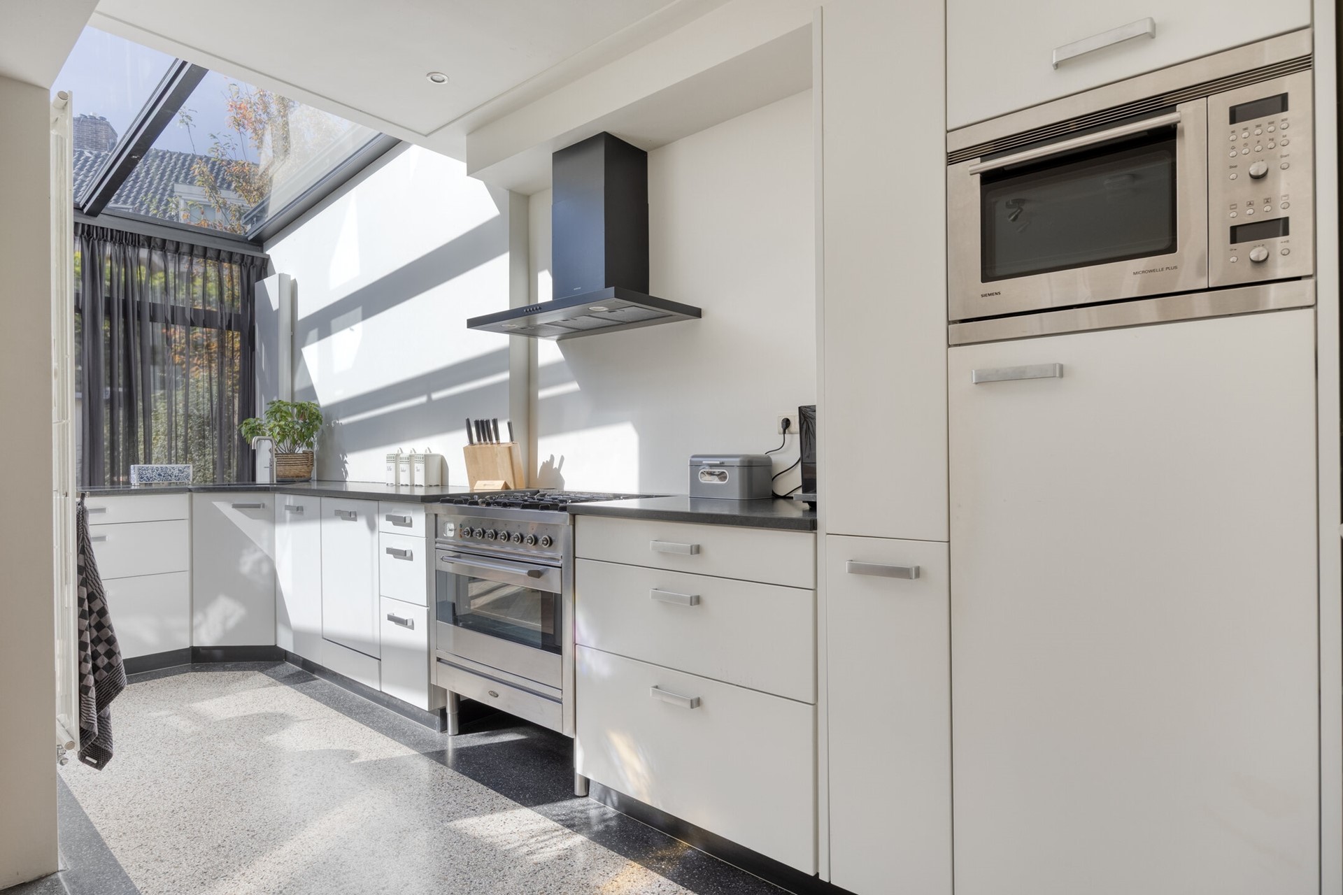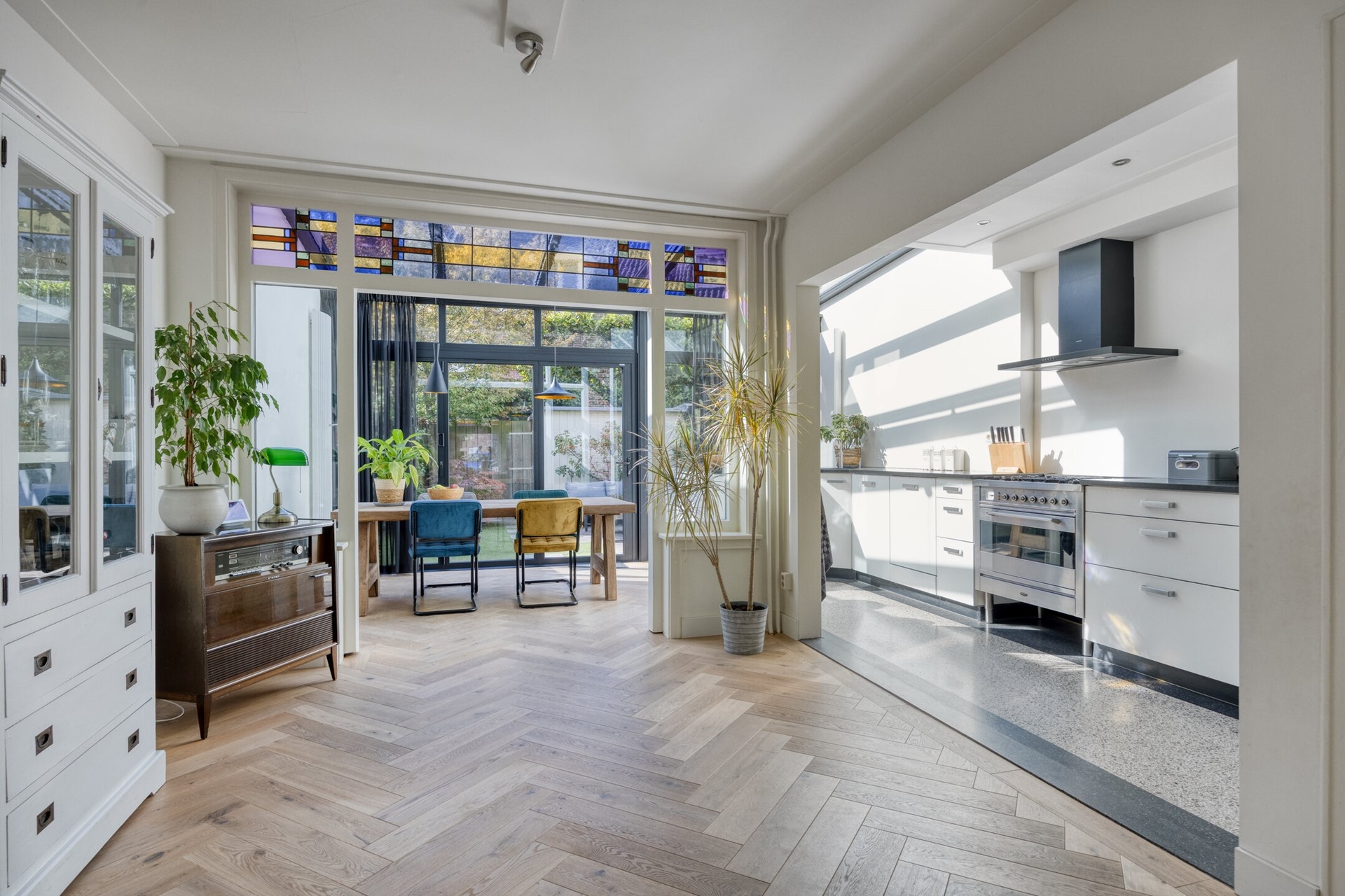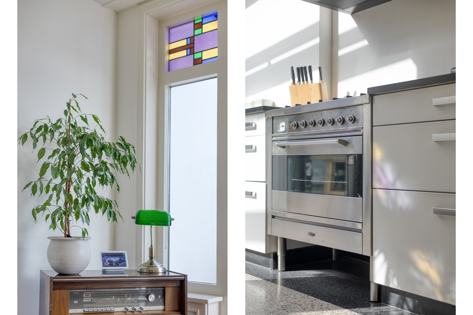 De karakteristieke halfronde voordeur leidt naar de hal met een prachtig originele terrazzovloer. Hier bevinden zich de meterkast, toiletruimte, kelderkast en trapopgang. Via een fraaie glas-in-lood deur kom je in de keuken met nieuwe terrazzovloer. En er is toegang vanuit de hal naar de woonkamer met weggewerkte toegang tot de kruipruimte en originele inbouwkast. De sfeervolle woonkamer heeft een erker voorzien van origineel glas in lood, een fraaie parketvloer (2022) en strak gestucte wanden. In 2022 is de glazen aanbouw aan de achterzijde van de woning gerealiseerd. Dit geeft een zee van ruimte, heerlijk veel licht en direct contact met de tuin. Er is uitpandig op afstand bestuurbare zonwering ingebouwd. De keuken is voorzien van een Boretti gasfornuis/oven, combi-magnetron, afzuigkap, koelkast, vaatwasser en quooker.