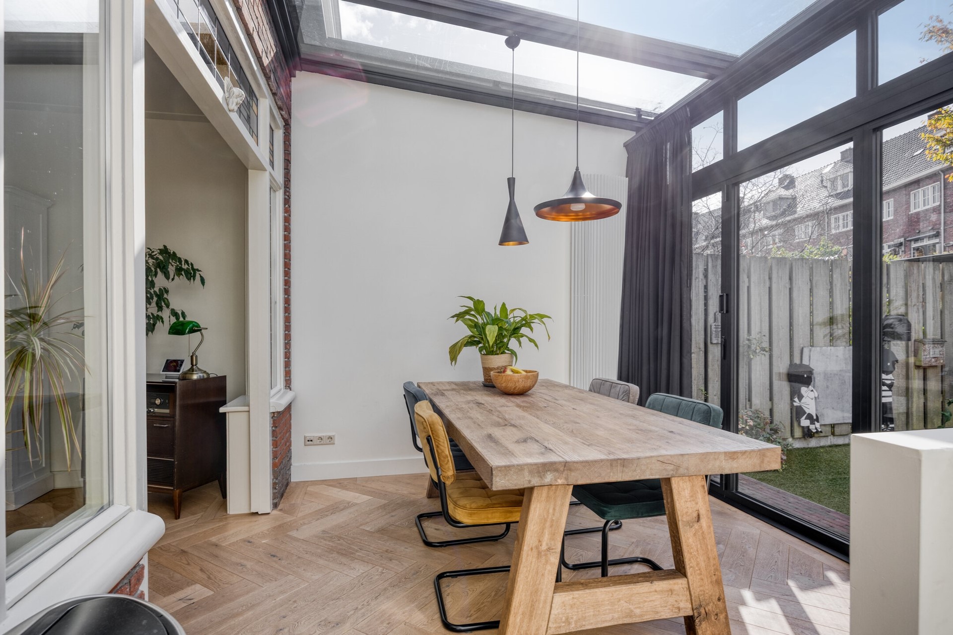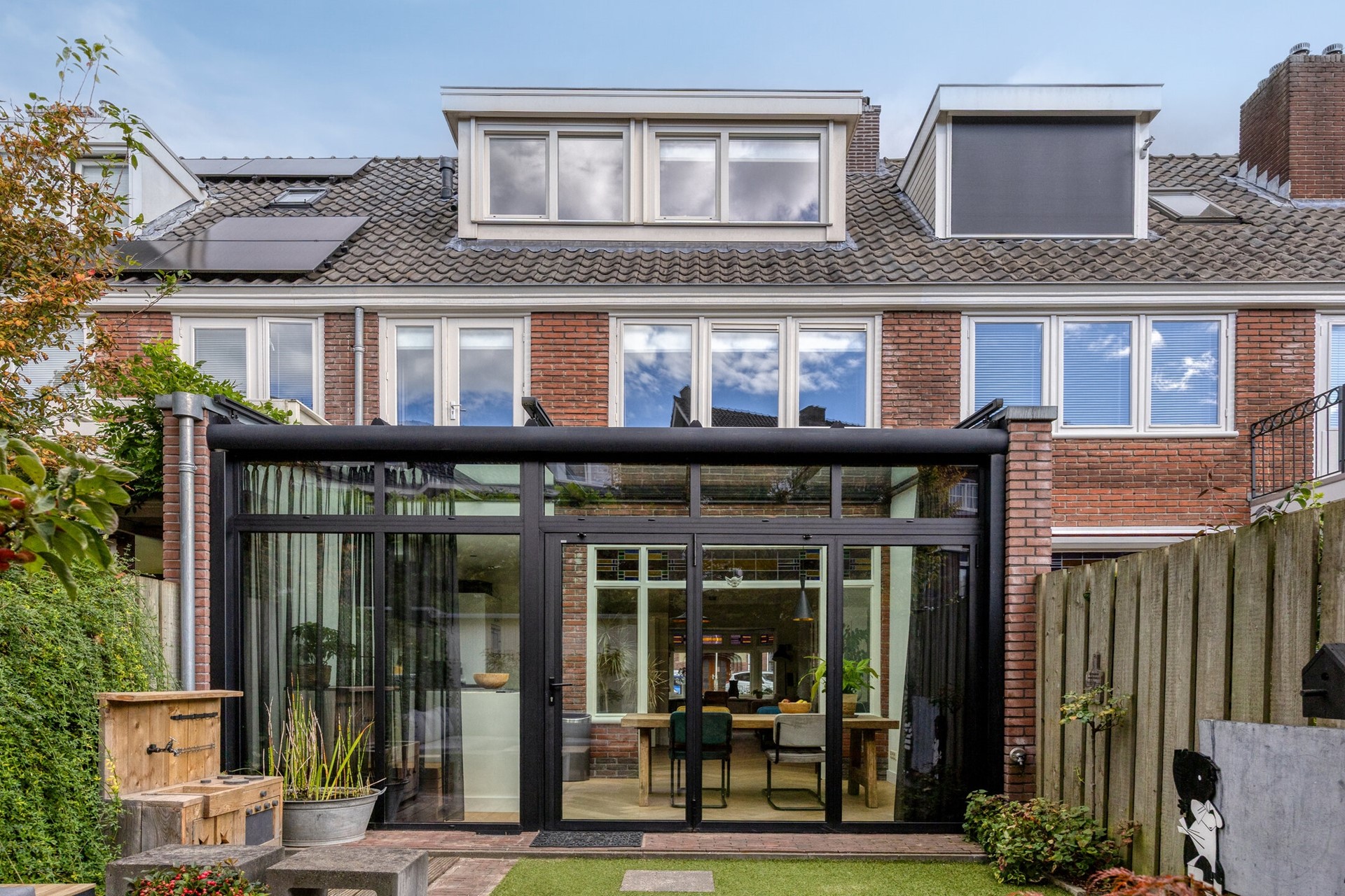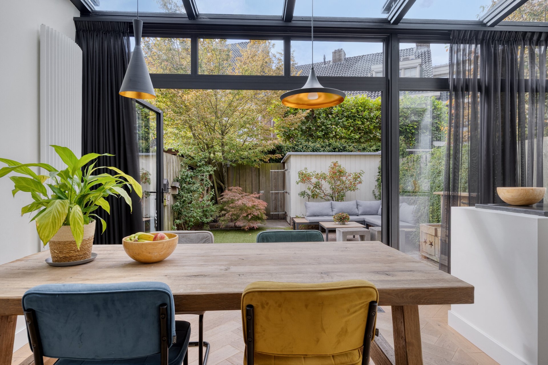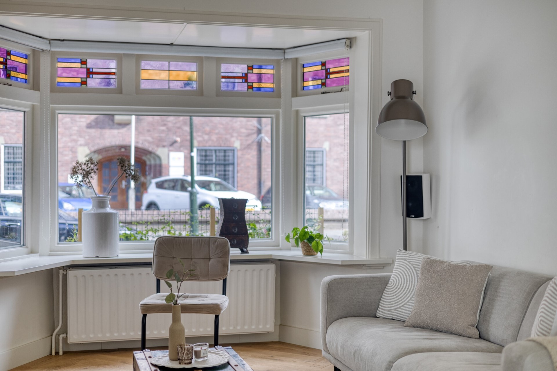 De karakteristieke halfronde voordeur leidt naar de hal met een prachtig originele terrazzovloer. Hier bevinden zich de meterkast, toiletruimte, kelderkast en trapopgang. Via een fraaie glas-in-lood deur kom je in de keuken met nieuwe terrazzovloer. En er is toegang vanuit de hal naar de woonkamer met weggewerkte toegang tot de kruipruimte en originele inbouwkast. De sfeervolle woonkamer heeft een erker voorzien van origineel glas in lood, een fraaie parketvloer (2022) en strak gestucte wanden. In 2022 is de glazen aanbouw aan de achterzijde van de woning gerealiseerd. Dit geeft een zee van ruimte, heerlijk veel licht en direct contact met de tuin. Er is uitpandig op afstand bestuurbare zonwering ingebouwd. De keuken is voorzien van een Boretti gasfornuis/oven, combi-magnetron, afzuigkap, koelkast, vaatwasser en quooker.