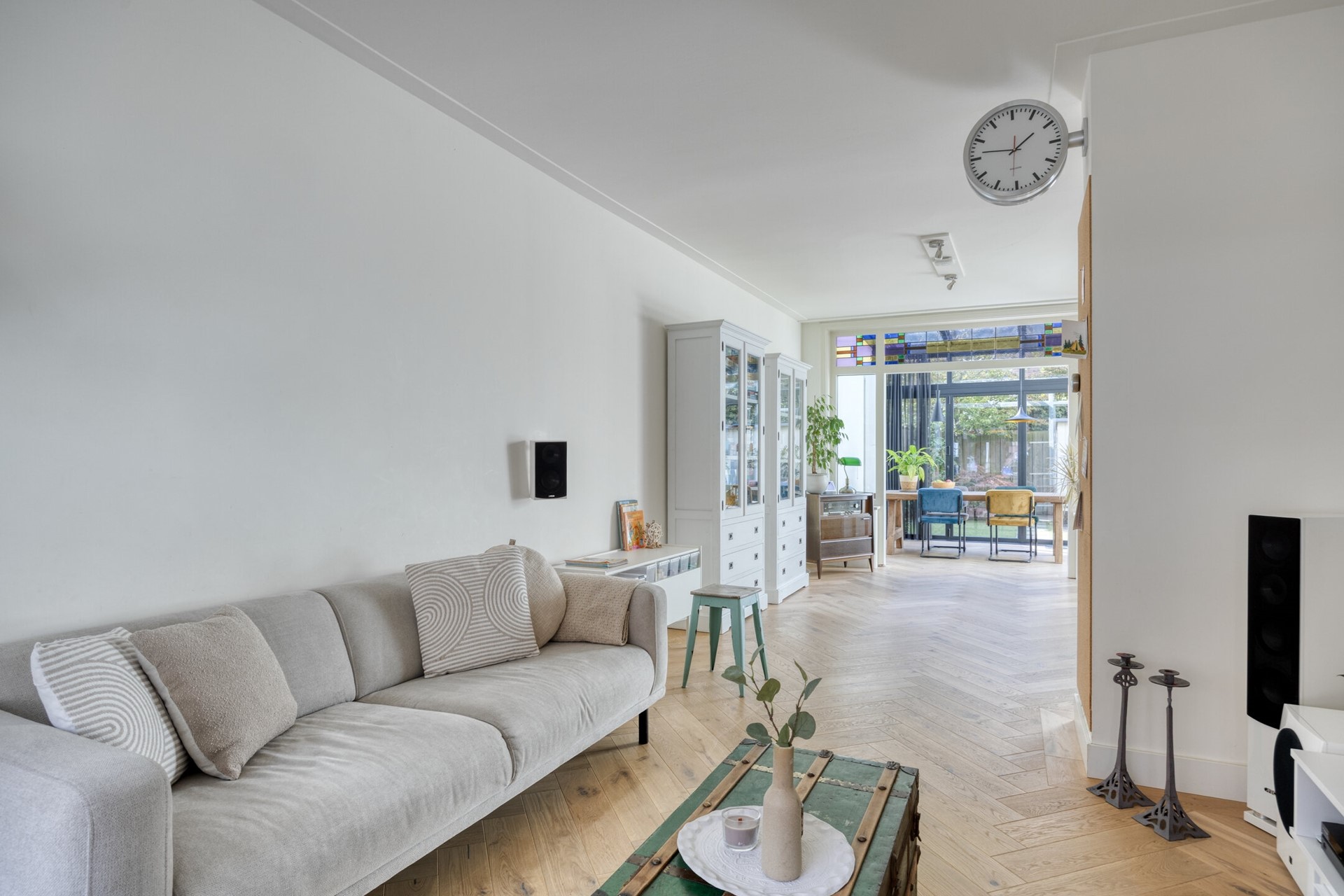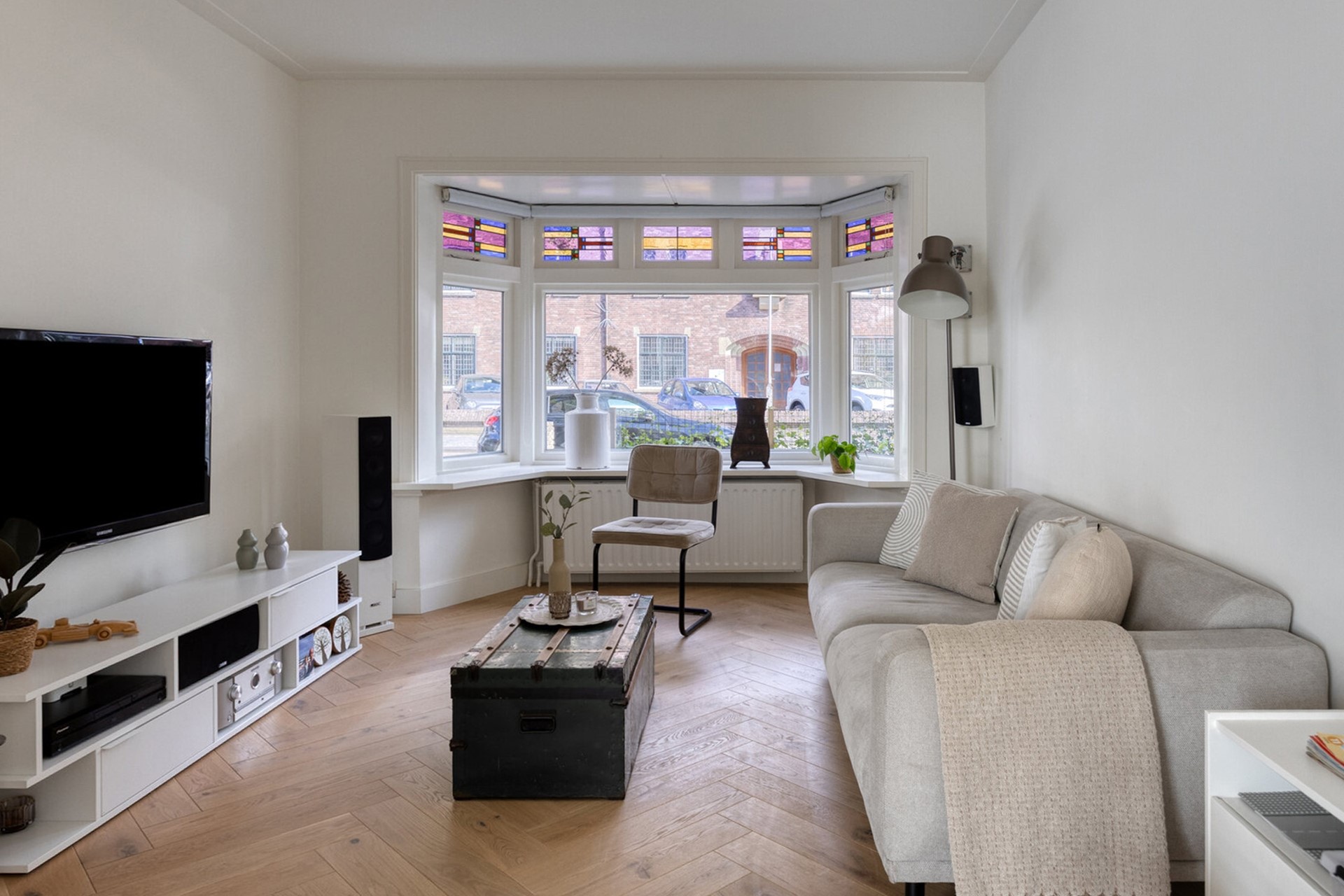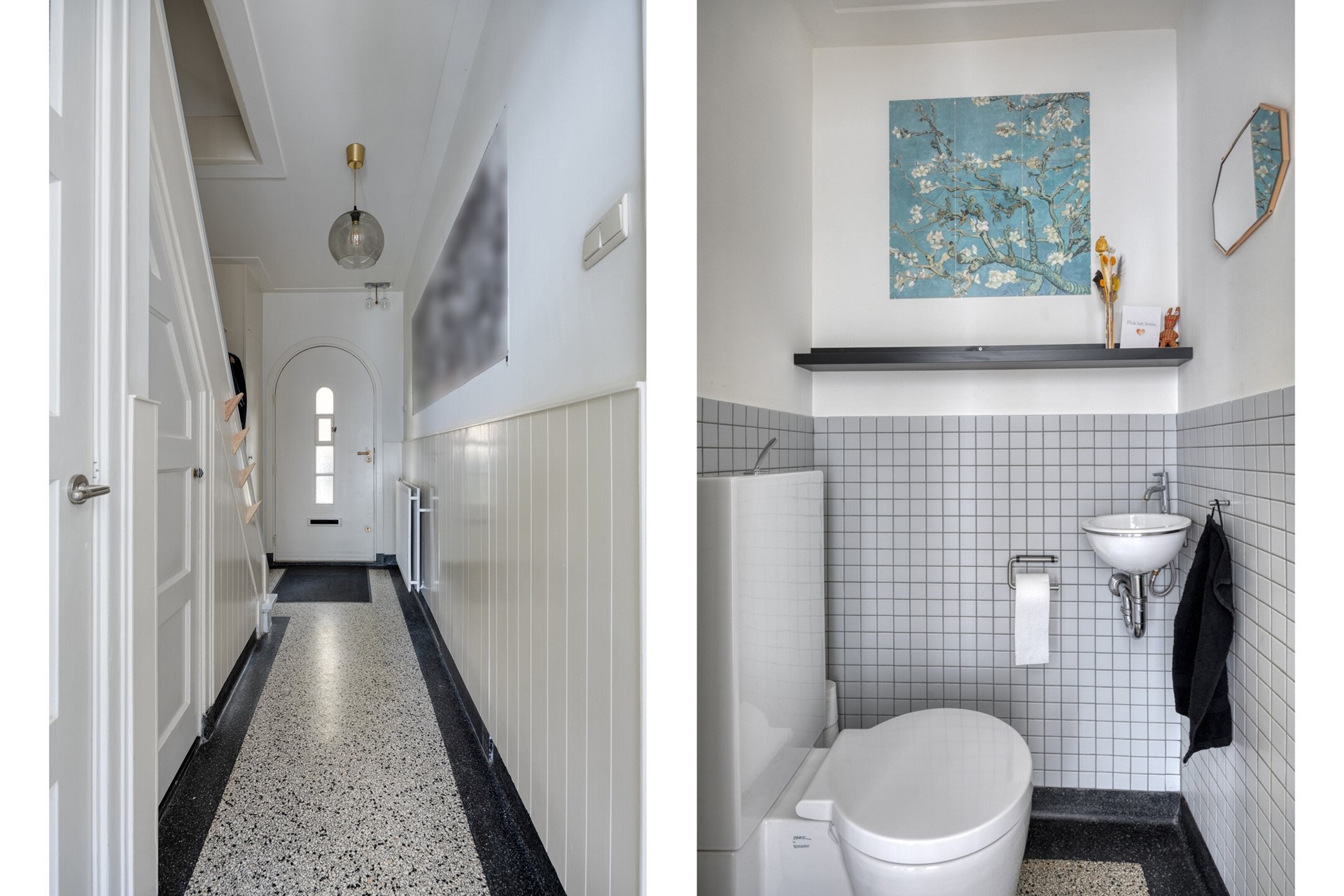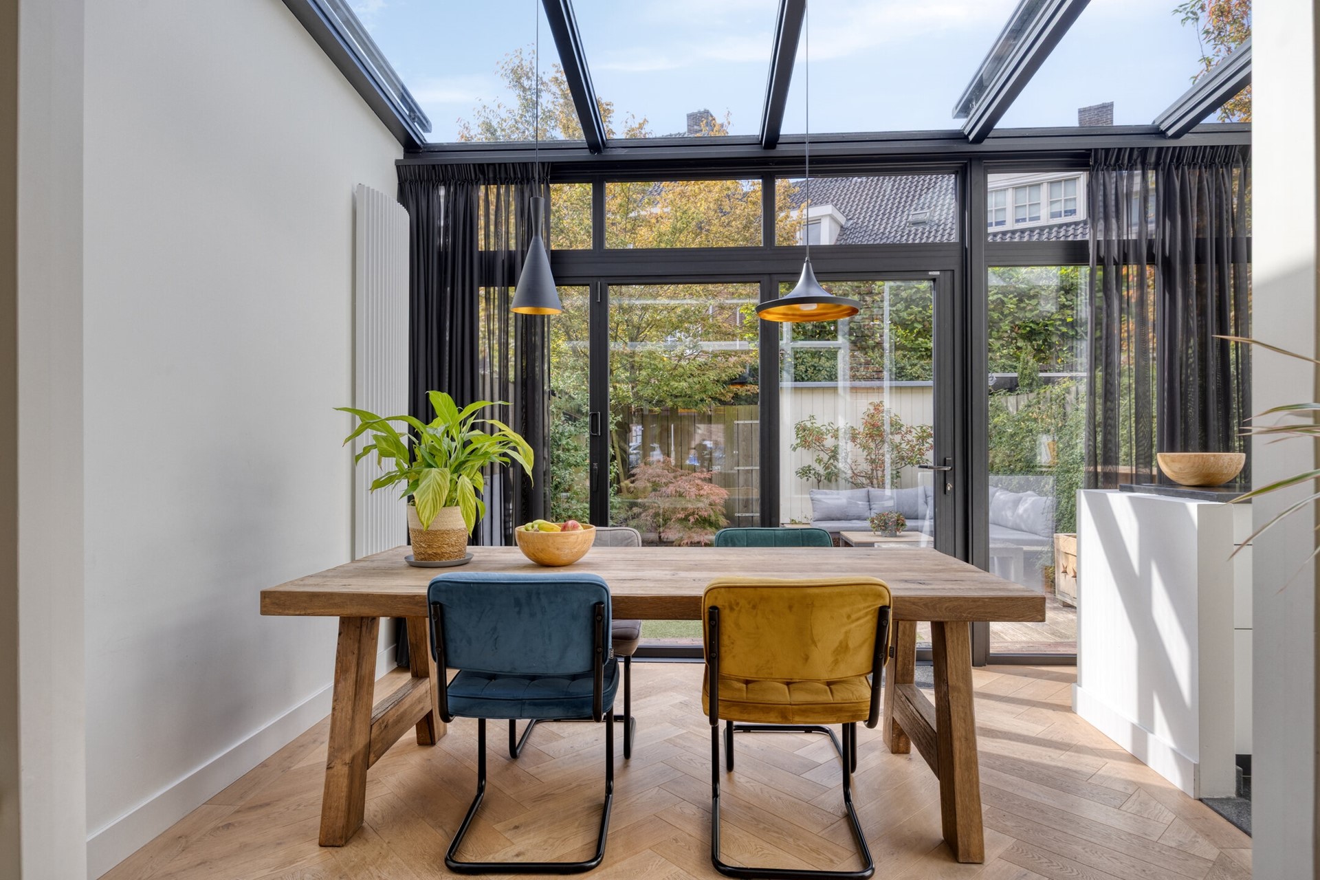 De karakteristieke halfronde voordeur leidt naar de hal met een prachtig originele terrazzovloer. Hier bevinden zich de meterkast, toiletruimte, kelderkast en trapopgang. Via een fraaie glas-in-lood deur kom je in de keuken met nieuwe terrazzovloer. En er is toegang vanuit de hal naar de woonkamer met weggewerkte toegang tot de kruipruimte en originele inbouwkast. De sfeervolle woonkamer heeft een erker voorzien van origineel glas in lood, een fraaie parketvloer (2022) en strak gestucte wanden. In 2022 is de glazen aanbouw aan de achterzijde van de woning gerealiseerd. Dit geeft een zee van ruimte, heerlijk veel licht en direct contact met de tuin. Er is uitpandig op afstand bestuurbare zonwering ingebouwd. De keuken is voorzien van een Boretti gasfornuis/oven, combi-magnetron, afzuigkap, koelkast, vaatwasser en quooker.