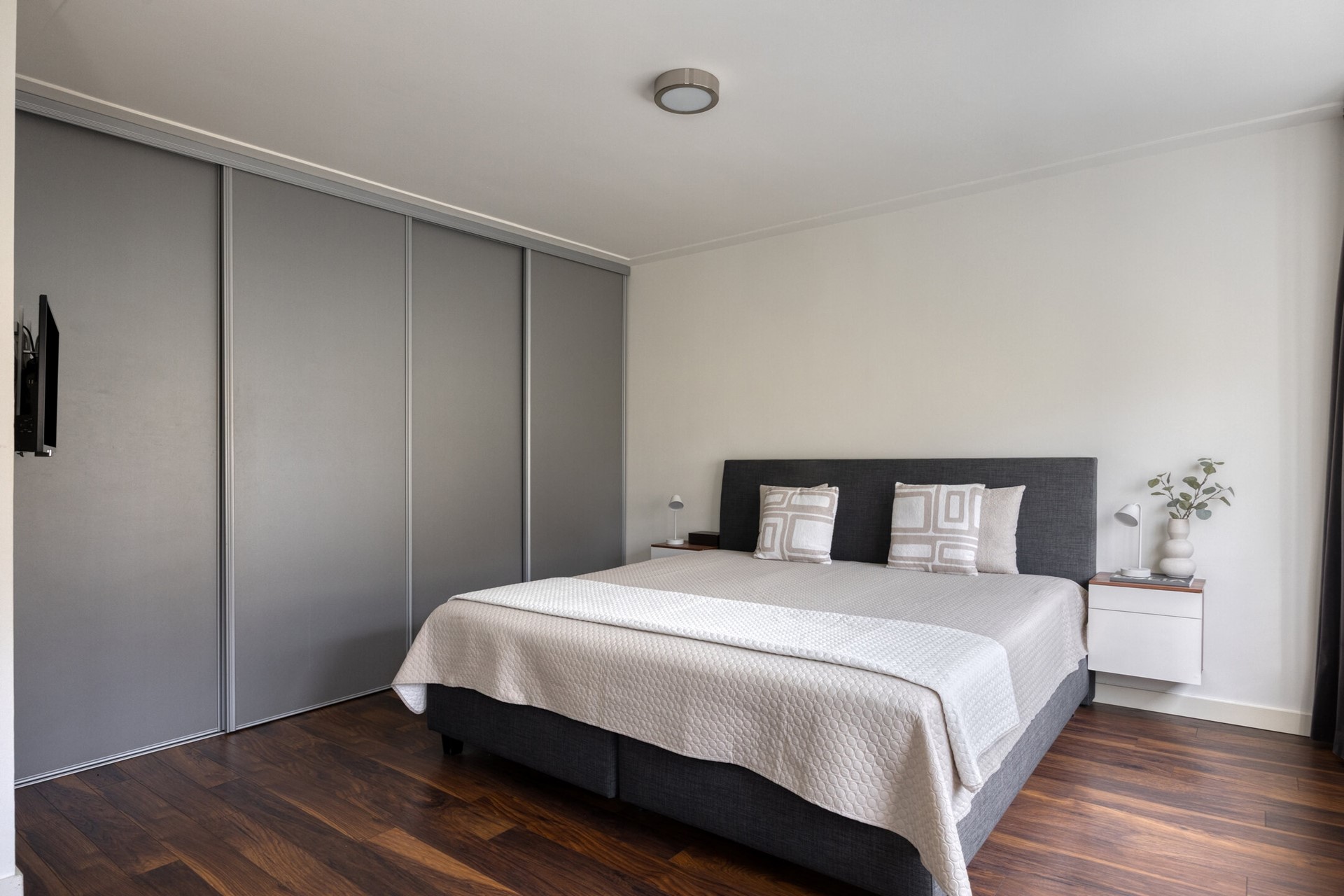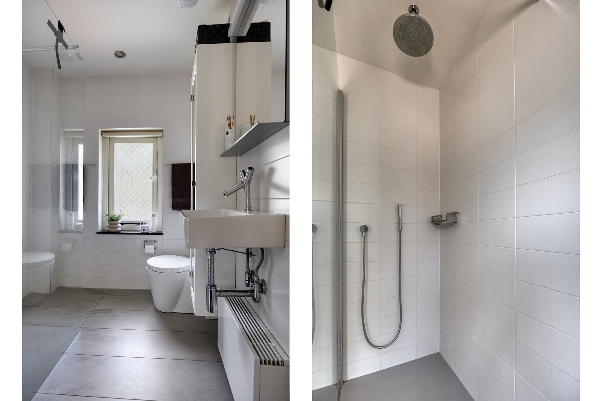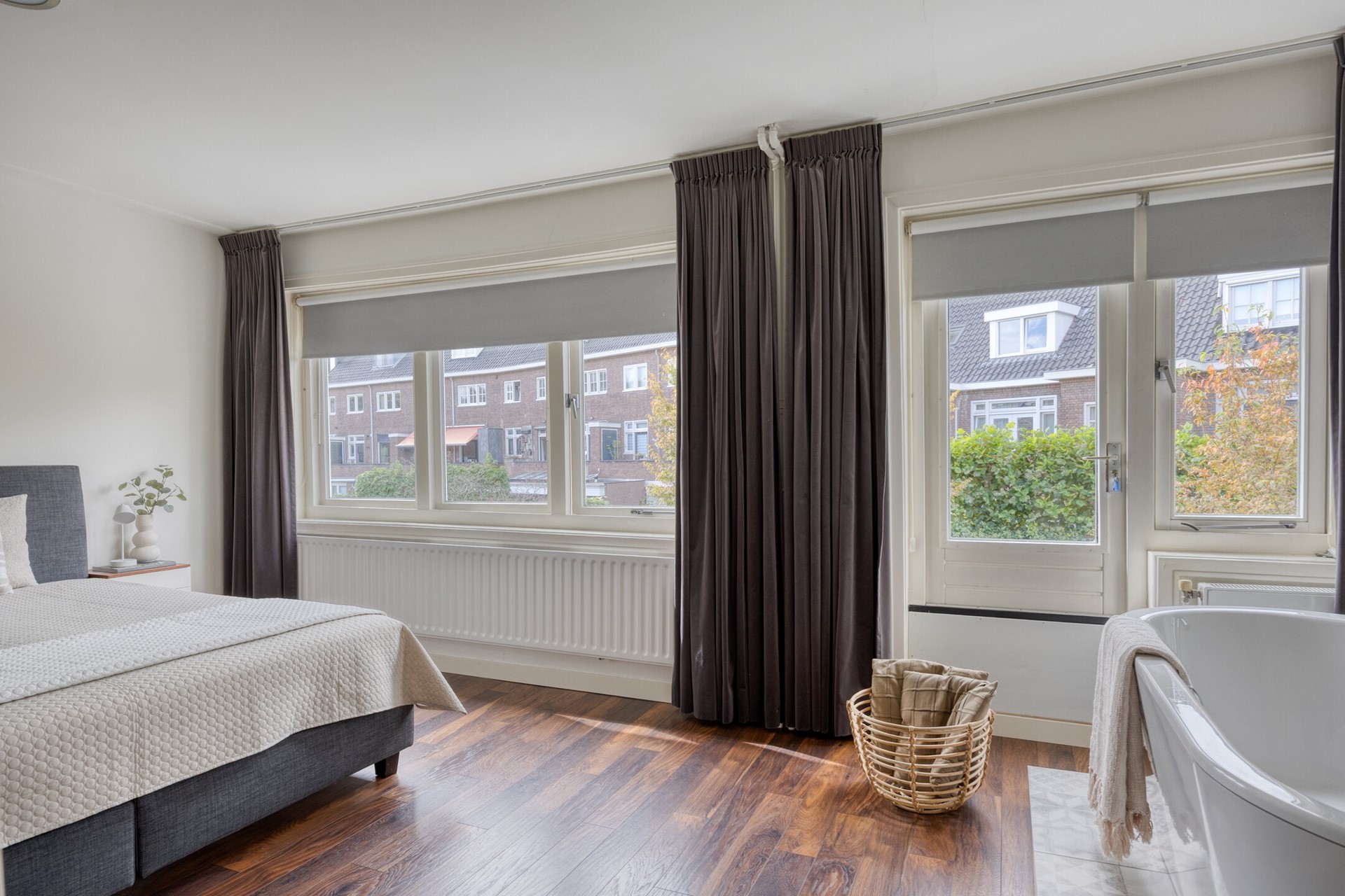 Overloop met originele paneeldeuren naar een tweetal (voorheen drie) mooie slaapkamers. De hoofdslaapkamer bevindt zich aan de achterzijde van de woning en is uitgerust met een vrijstaand ligbad en een vaste kastenwand met schuifdeuren. De tweede slaapkamer ligt aan de voorzijde en heeft een open inbouw(boeken)kast. De badkamer is voorzien van een inloopdouche, een wastafel en tweede toilet. De vaste trap leidt naar de tweede verdieping.