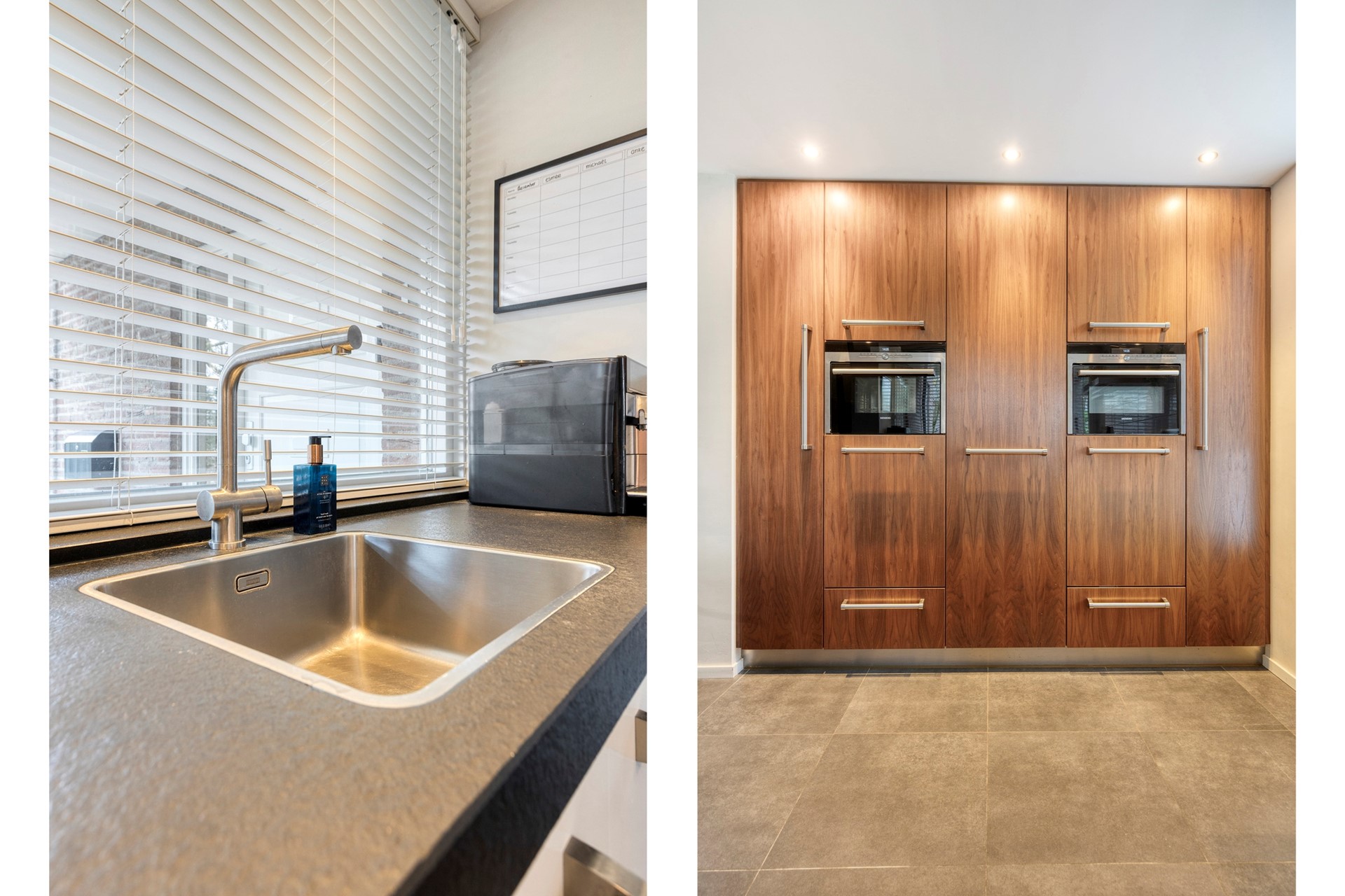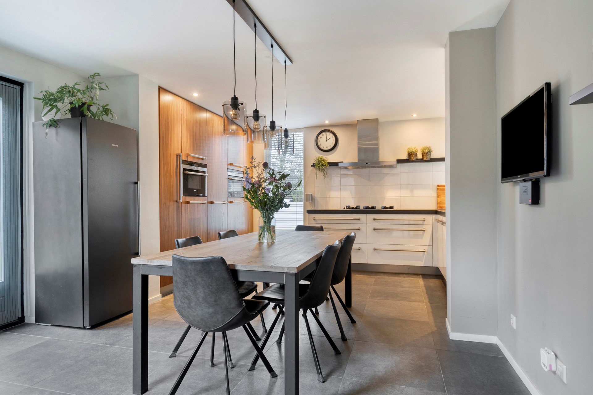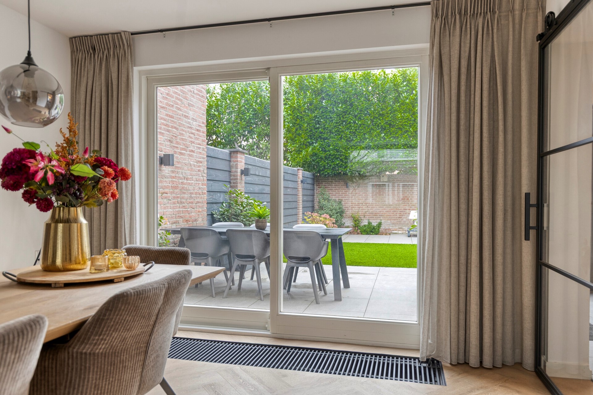 Aan de achterzijde ligt de woonkeuken: een plek waar je niet alleen kookt, maar ook leeft. Vanuit hier loop je via de openslaande tuindeuren zo de tuin in.