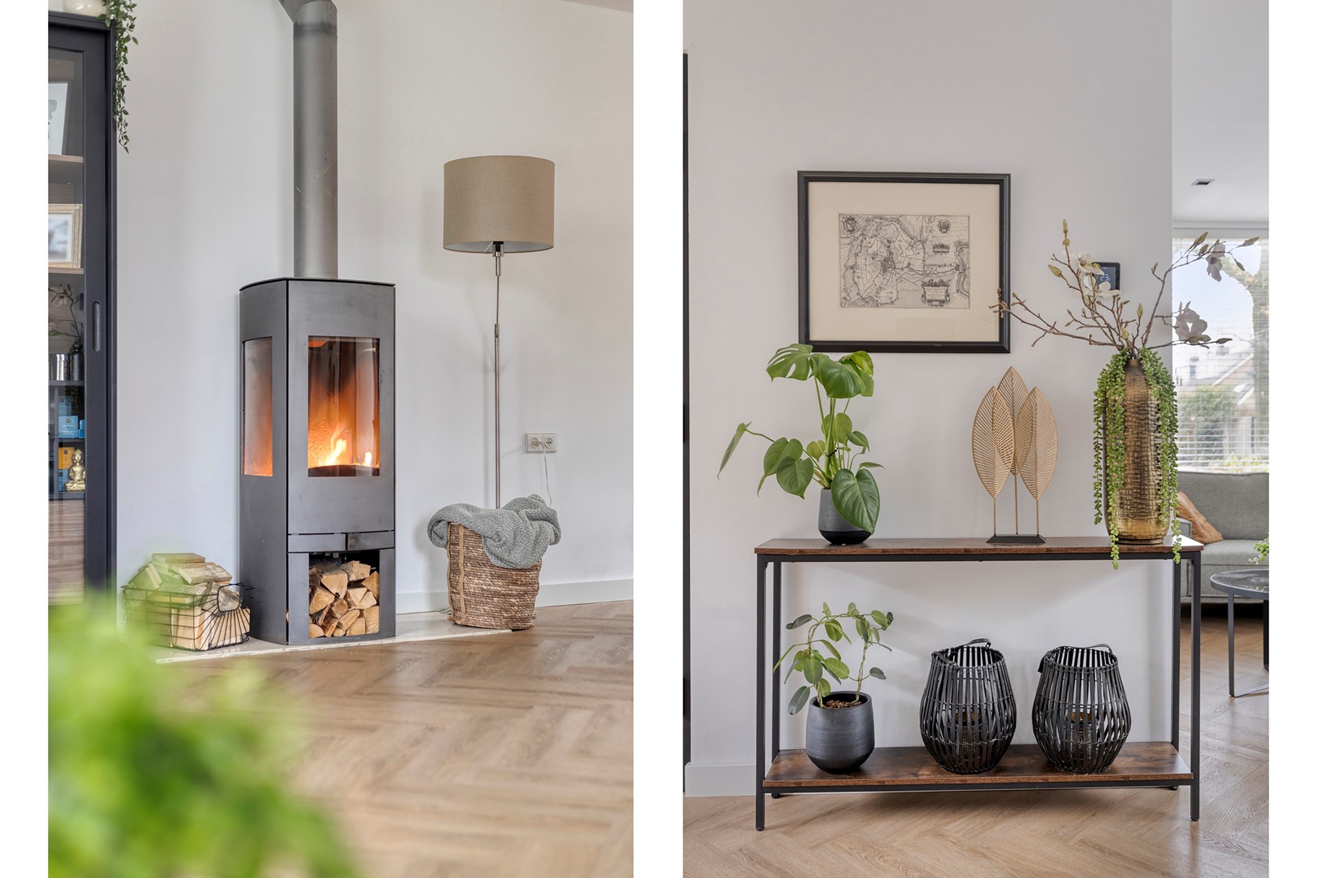 Het zitgedeelte bevindt zich aan de voorzijde van de woonkamer, hier is voldoende ruimte om een aangename zithoek te creëren. Vanwege de hoeken is het ondanks de grootte toch een knusse ruimte. De houtkachel zorgt voor veel sfeer.