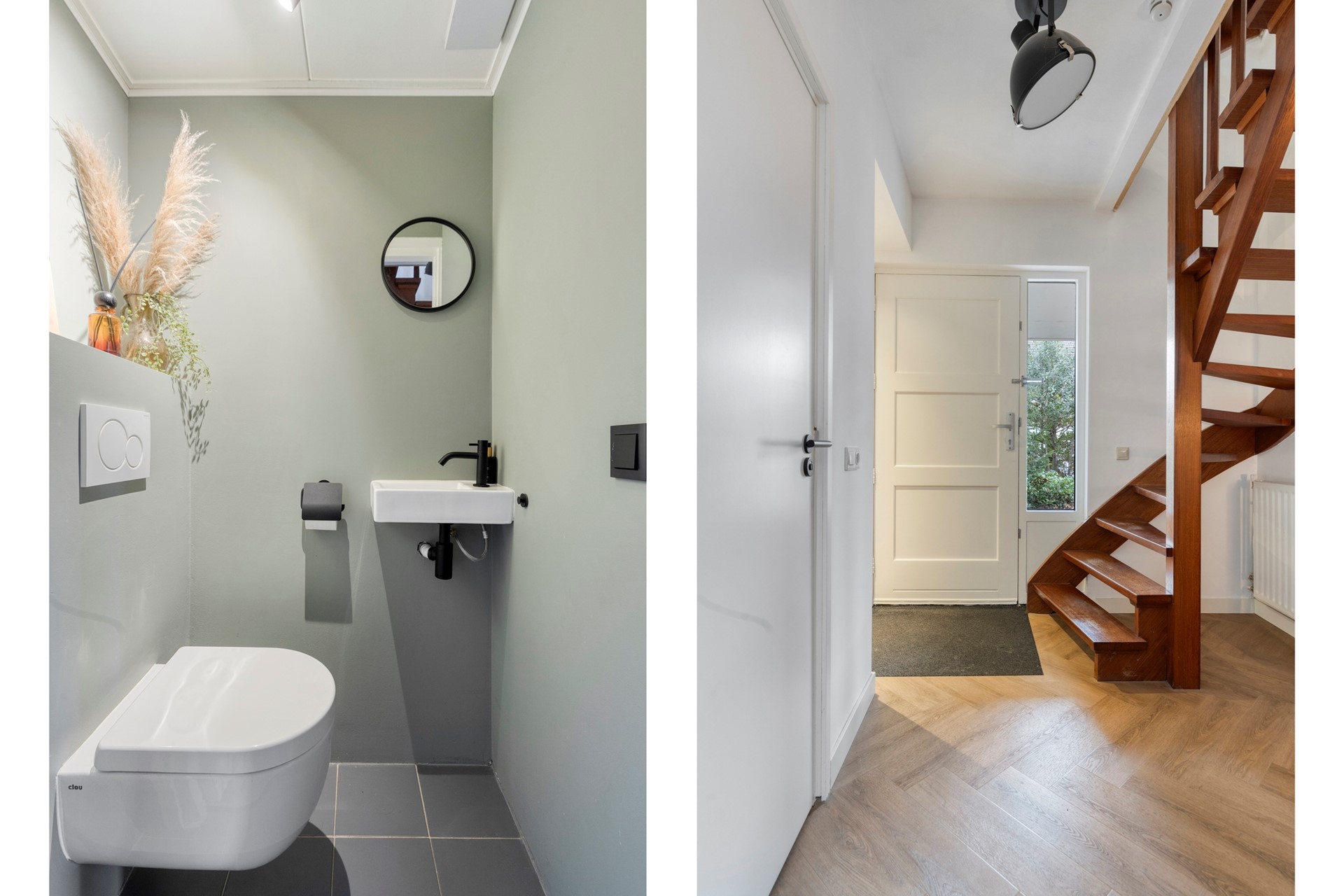 Binnenkomst in de hal met meterkast (vernieuwd), toilet (2021), garderobe, trapopgang naar de eerste verdieping en toegang naar de woonkamer via een moderne stalen deur.