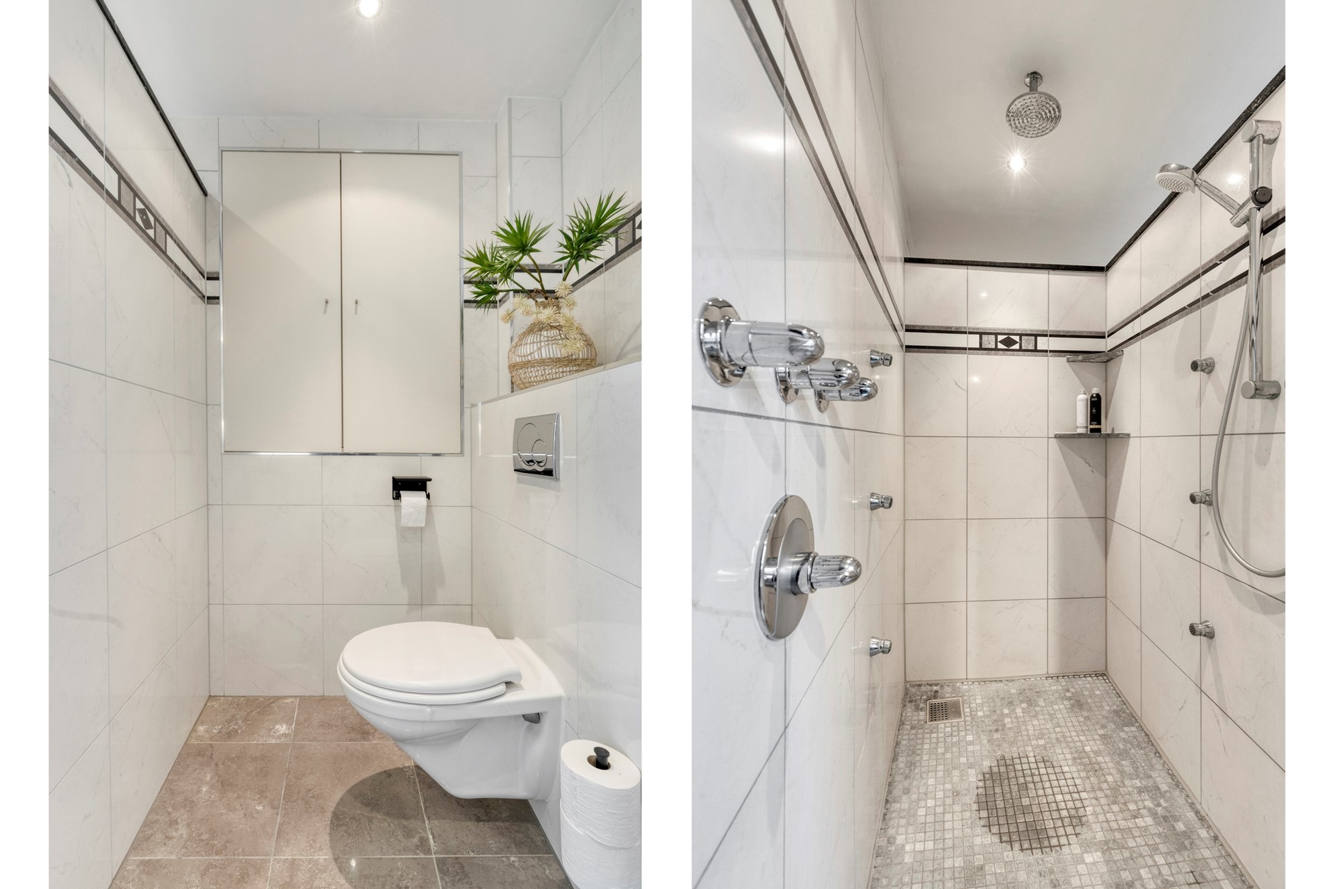 De cv ketel (Remeha 2021) en de omvormer van de zonnepanelen zijn netjes weggewerkt. Deze ruimte is toegankelijk vanaf de voorzolder en biedt tevens veel opbergruimte. Ook is hier de opstelling voor de wasmachine en droger.