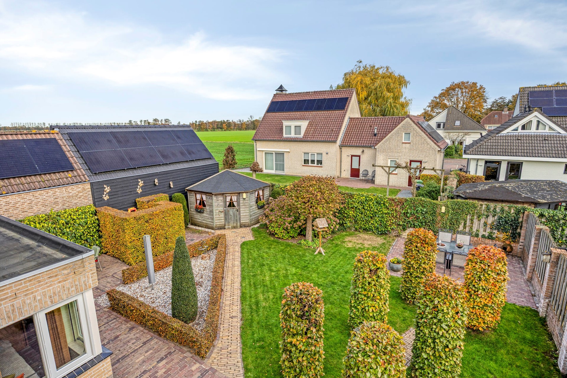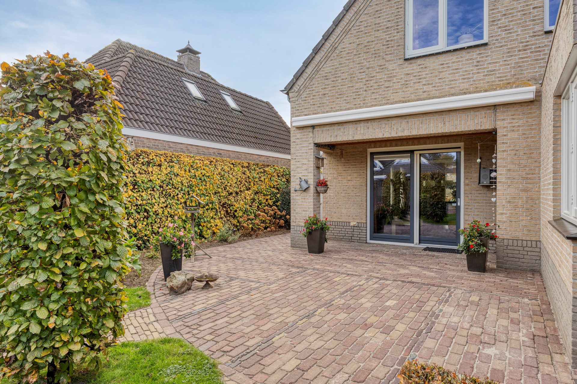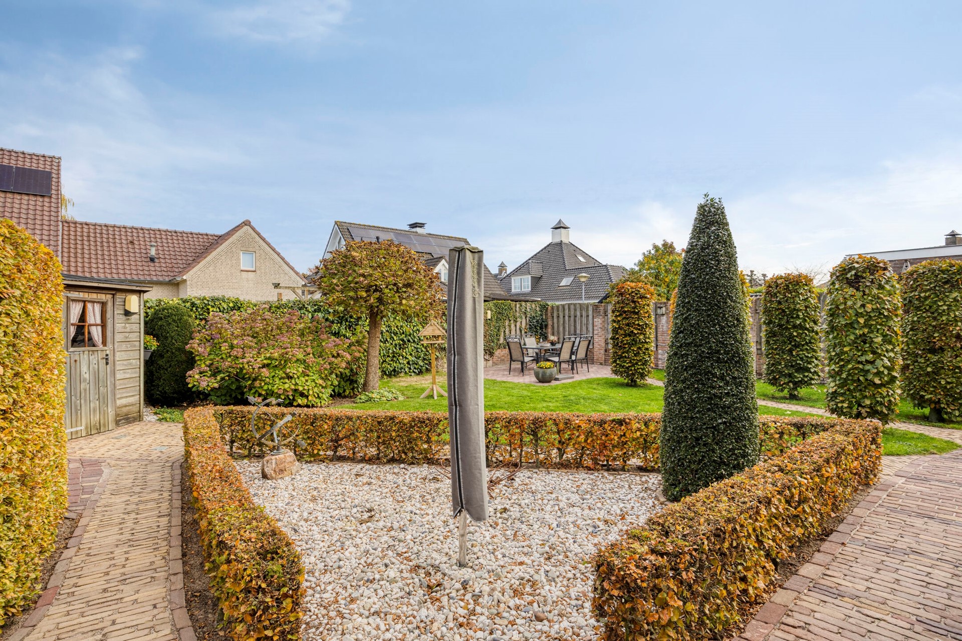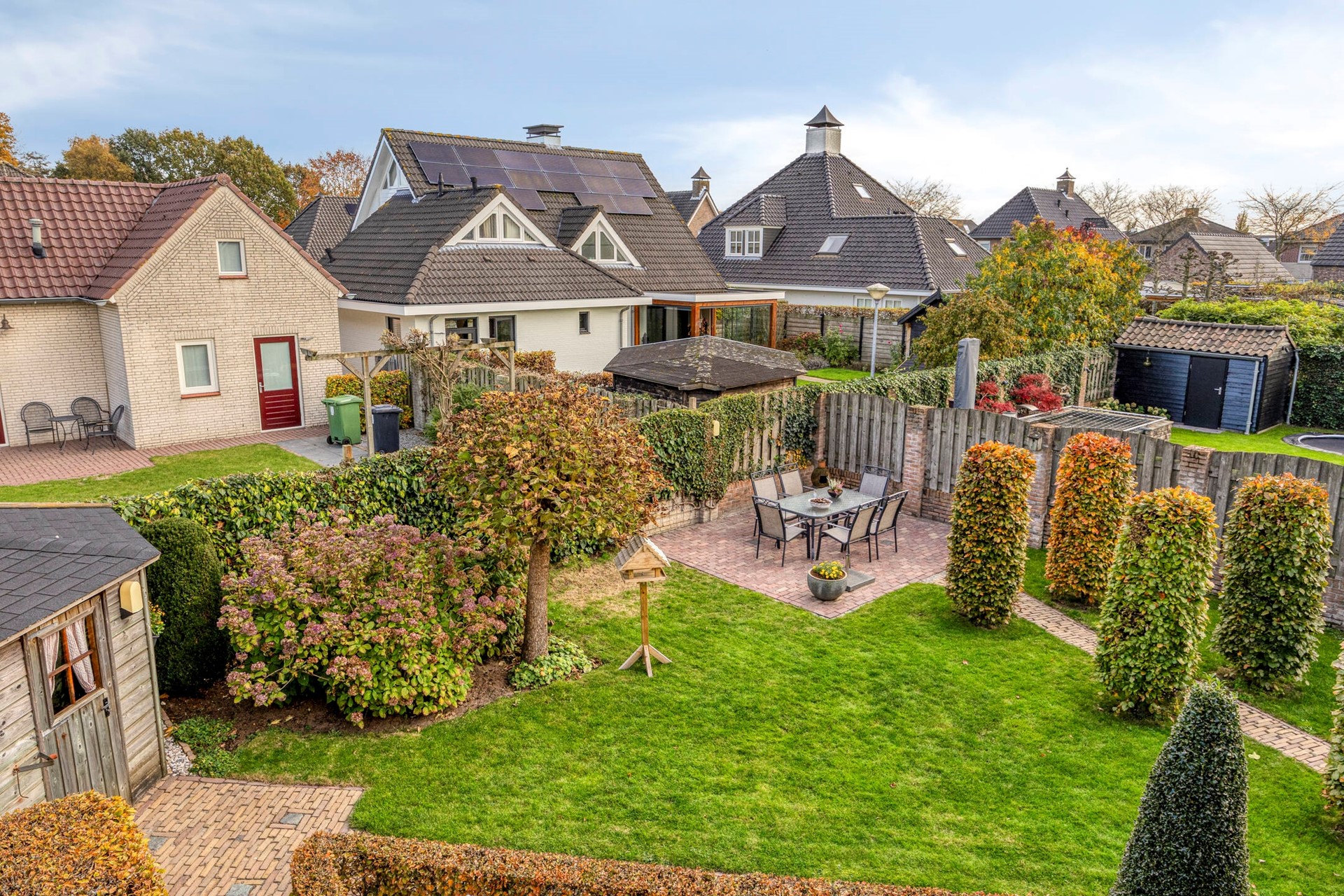 De ruime en keurig aangelegde achtertuin is een heerlijke plek om te ontspannen. Je geniet hier volop van de privacy. De tuin is voorzien van een tuinhuisje voor extra opbergruimte. Er kunnen verschillende zitjes gecreëerd worden in de zon of schaduw. Er is een grote elektrische zonneluifel aanwezig bij de schuifpui. Daarnaast beschikt de woning over een oprit voor meerdere auto’s.