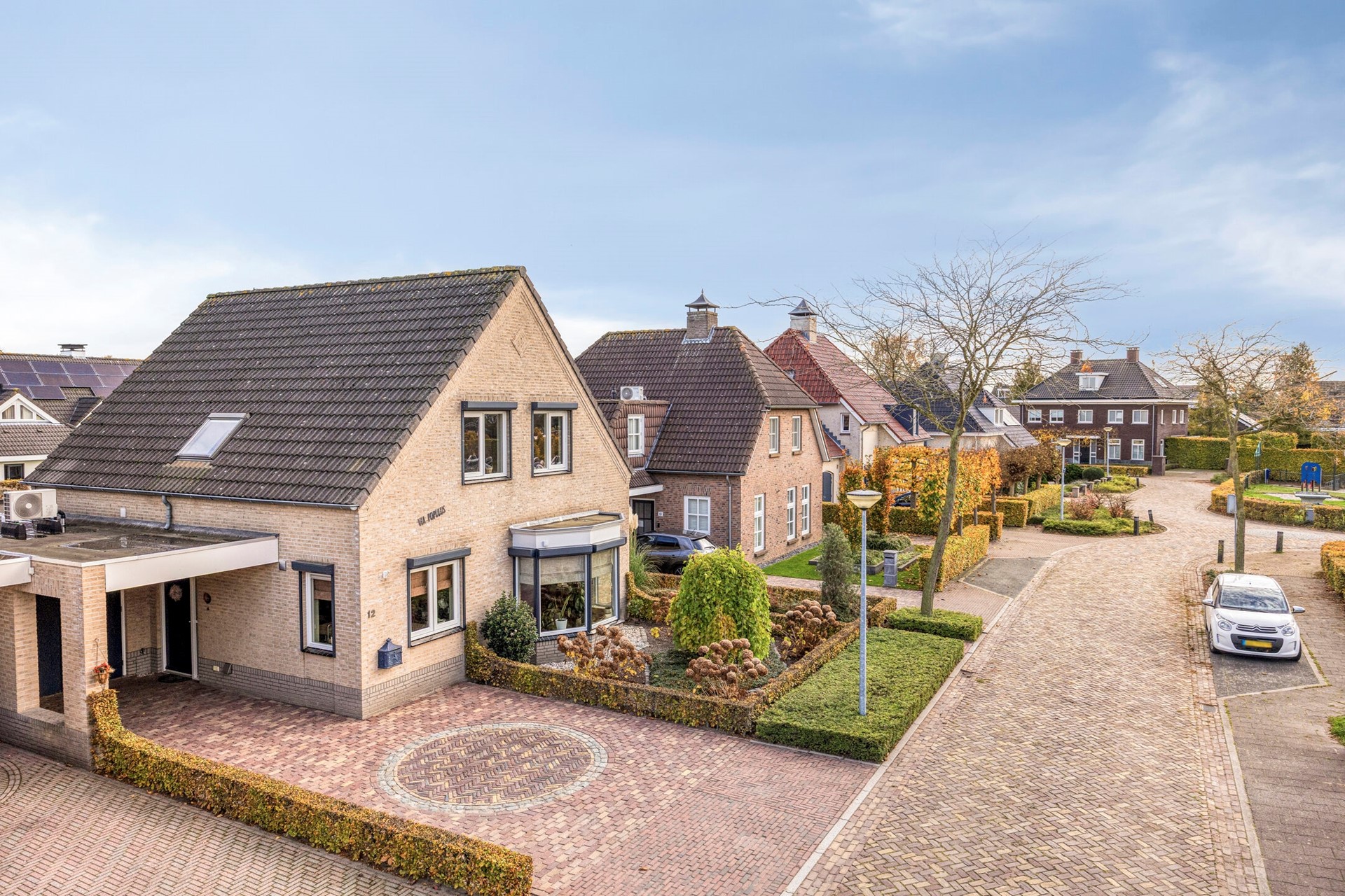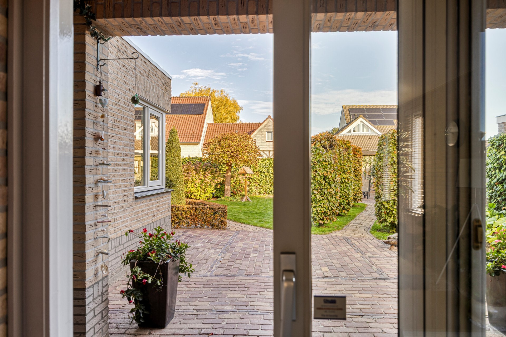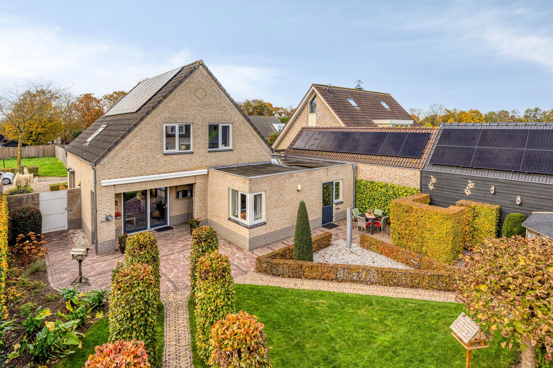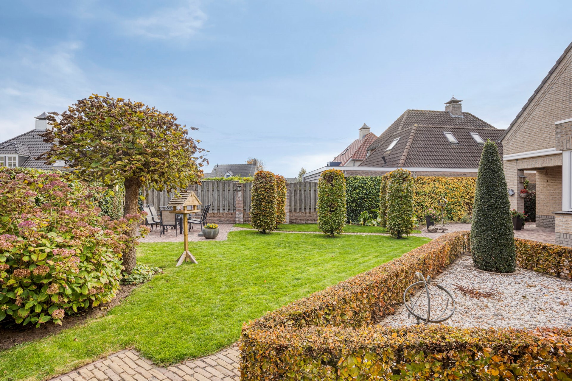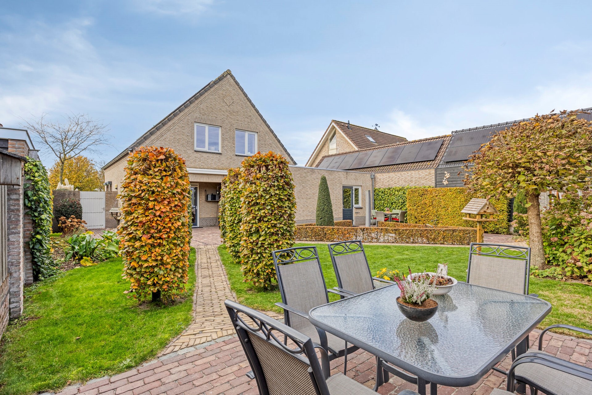 De ruime en keurig aangelegde achtertuin is een heerlijke plek om te ontspannen. Je geniet hier volop van de privacy. De tuin is voorzien van een tuinhuisje voor extra opbergruimte. Er kunnen verschillende zitjes gecreëerd worden in de zon of schaduw. Er is een grote elektrische zonneluifel aanwezig bij de schuifpui. Daarnaast beschikt de woning over een oprit voor meerdere auto’s.