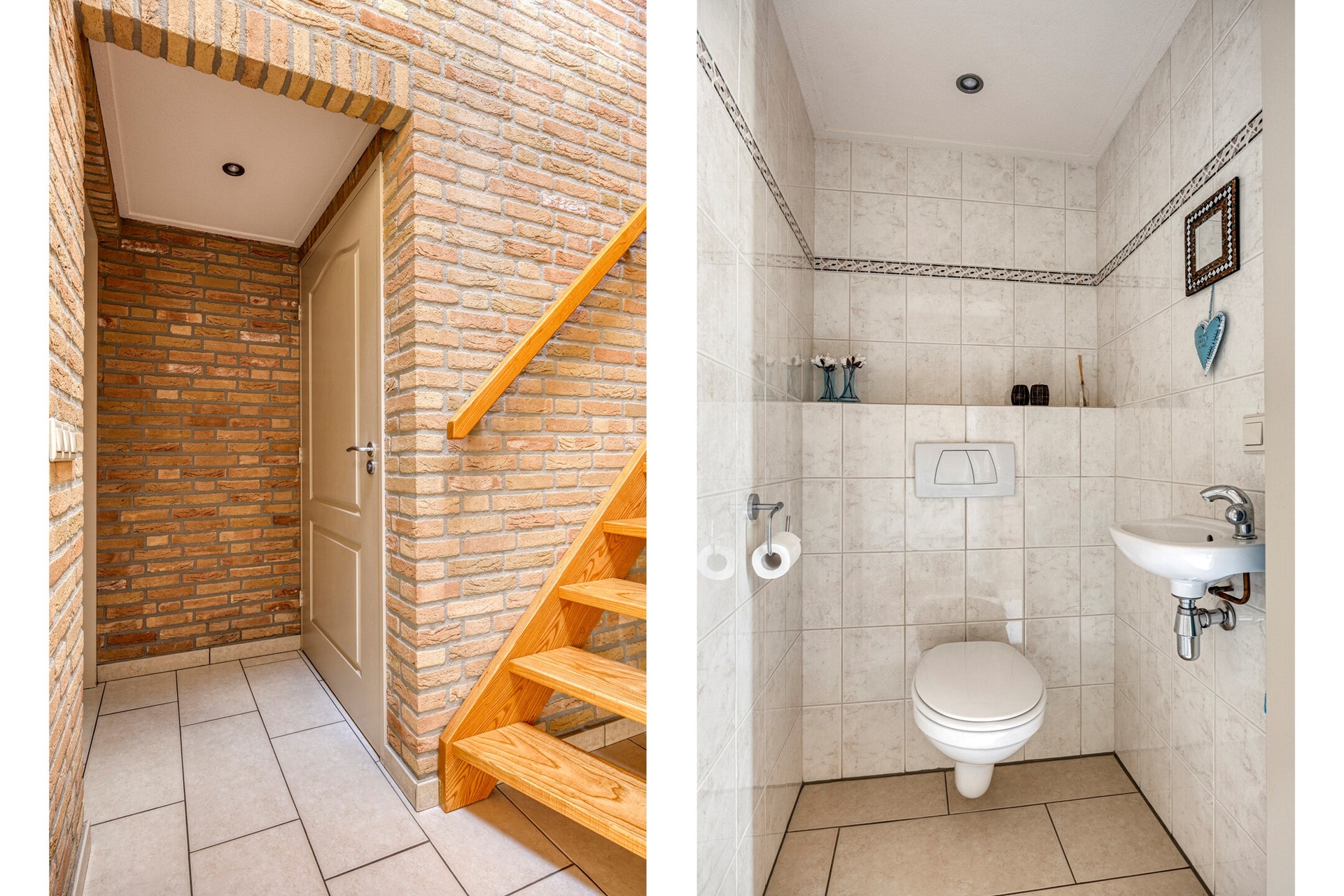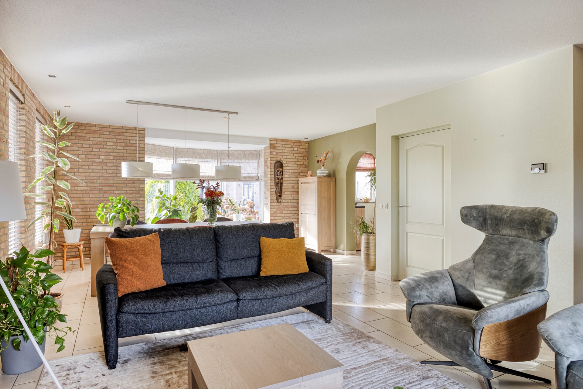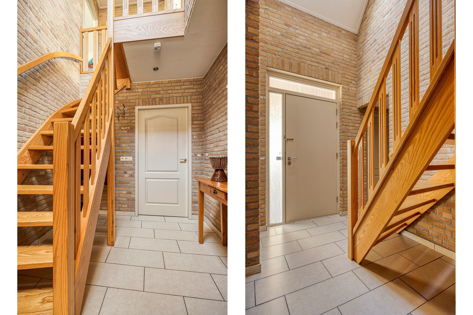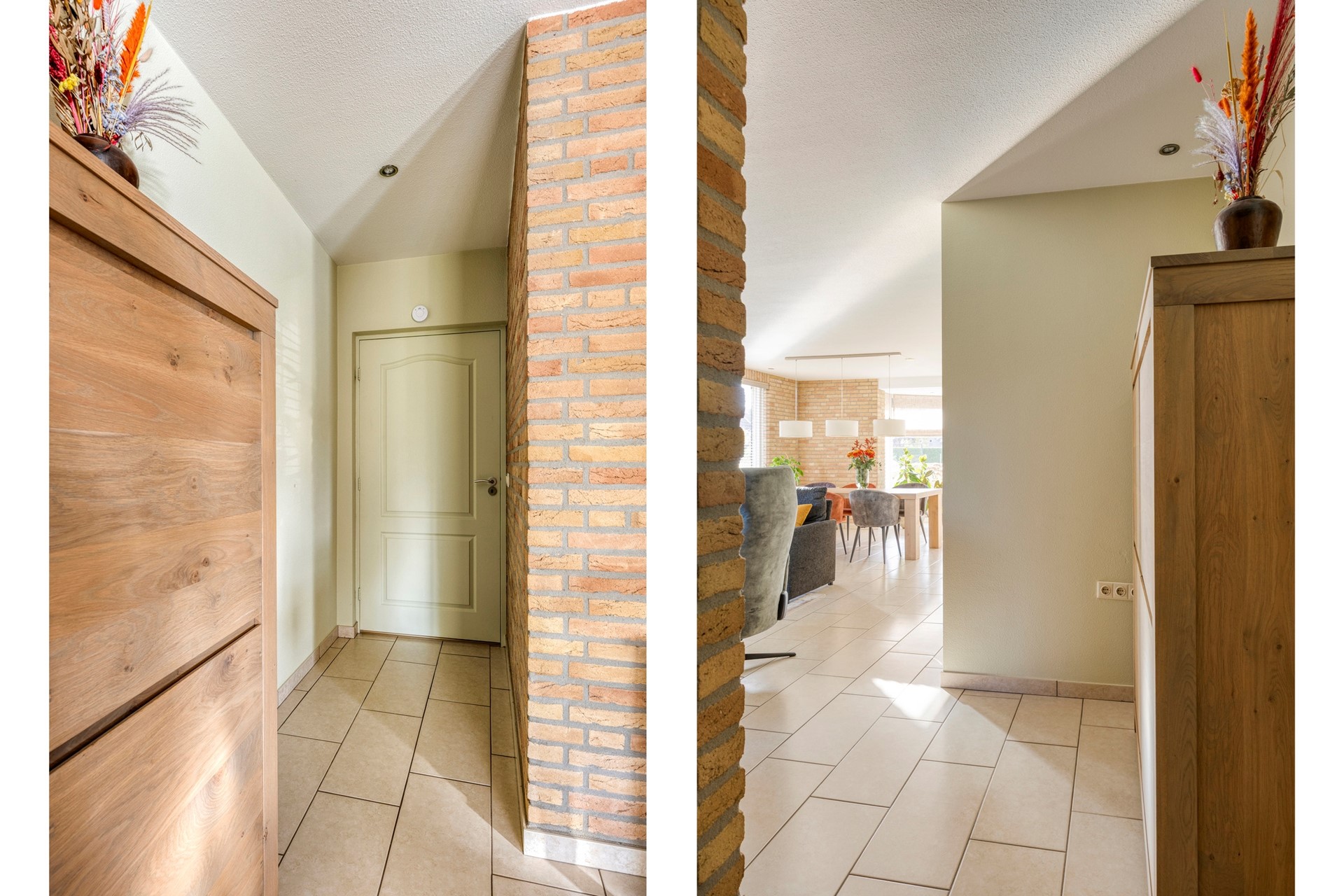 Je kunt via de voordeur naar binnen of volgens Brabantse traditie via de achterdeur (in dit geval de inpandige garage). Wanneer je via de voordeur/hal de woning betreedt valt direct de ruimtelijkheid van de woning op. Hier bevinden zich de meterkast, garderobe, toiletruimte en de trapopgang naar de eerste verdieping.