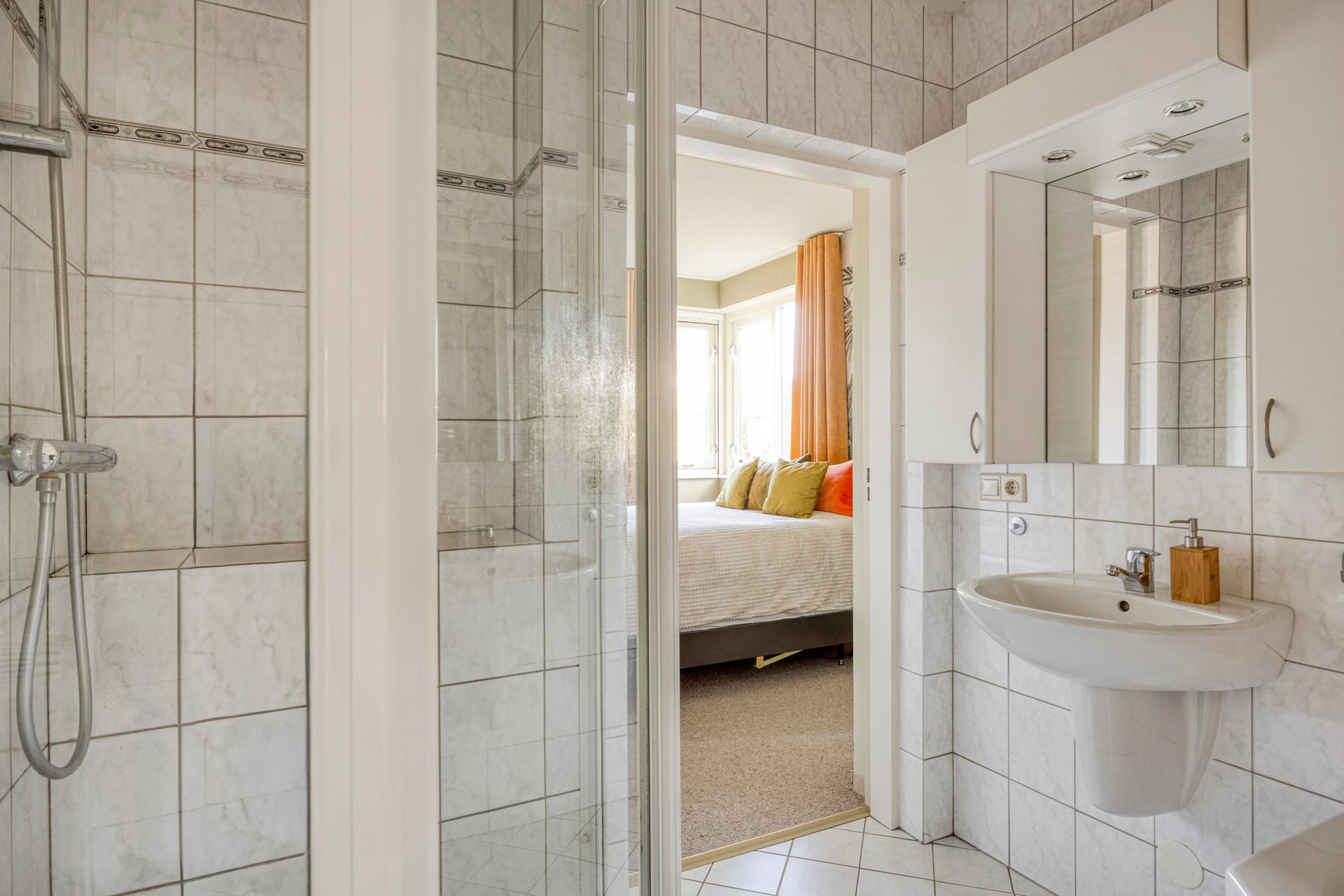 Via de woonkamer is er toegang naar de slaapkamer met een en-suite badkamer. De slaapkamer ligt aan de achterzijde van de woning en aan de tuin. De wand in de slaapkamer is exclusief bespannen met bedrukt linnen. Echt een eyecatcher. De badkamer is voorzien van een ligbad, toilet en een wastafel. Op de gehele begane grond ligt vloerverwarming. De slaapkamer/badkamer maakt de woning ideaal voor gelijkvloers wonen of als comfortabele gastenkamer.