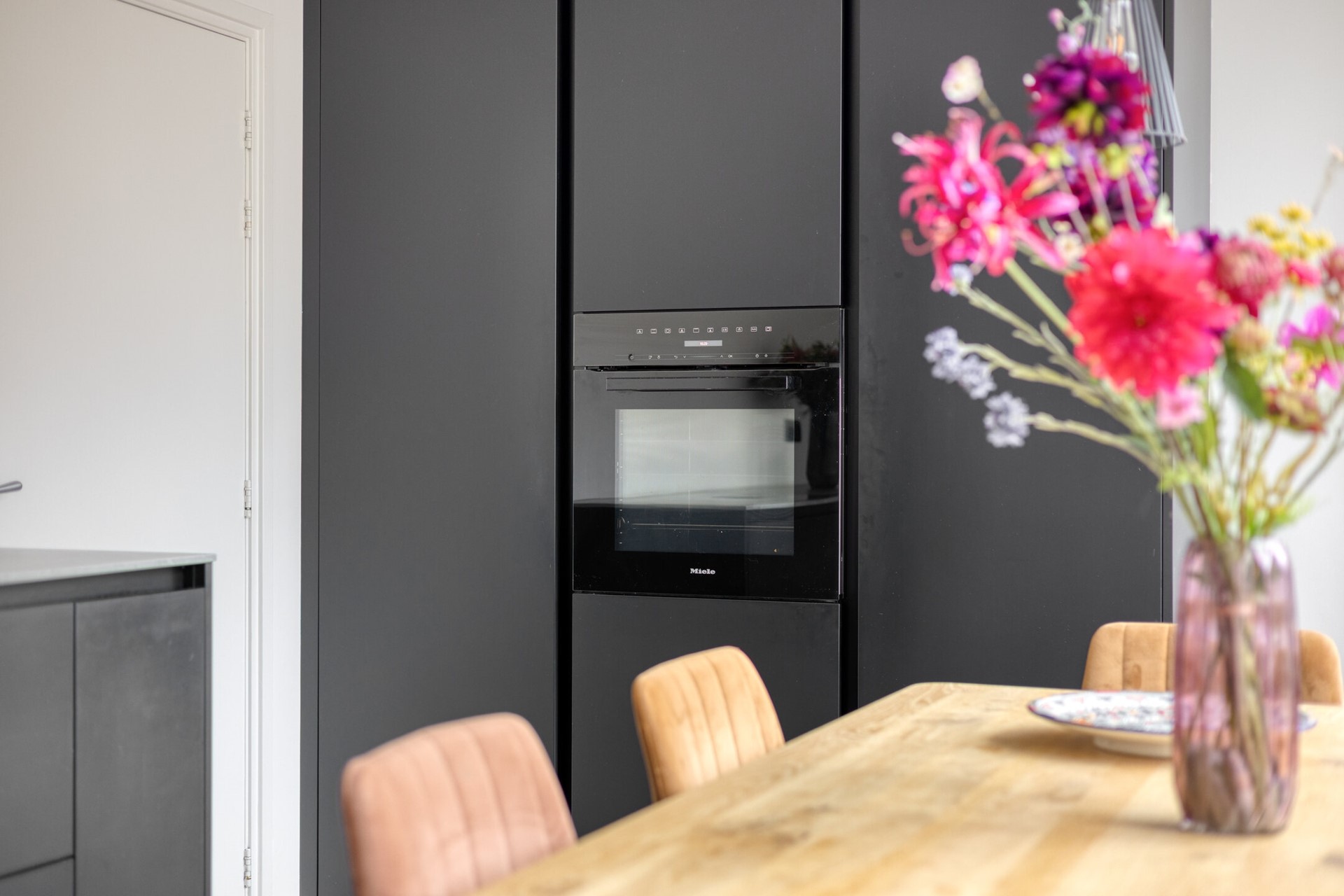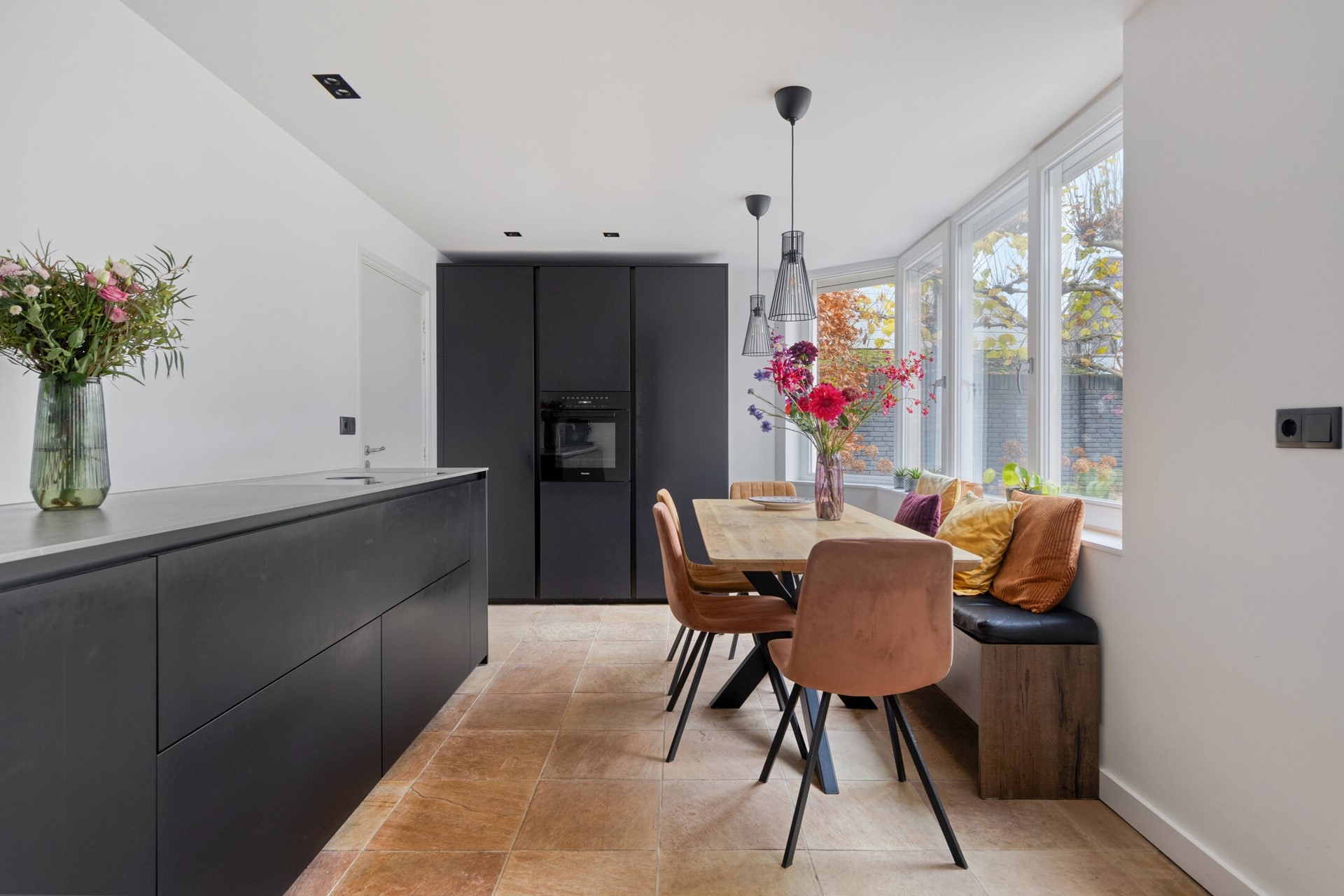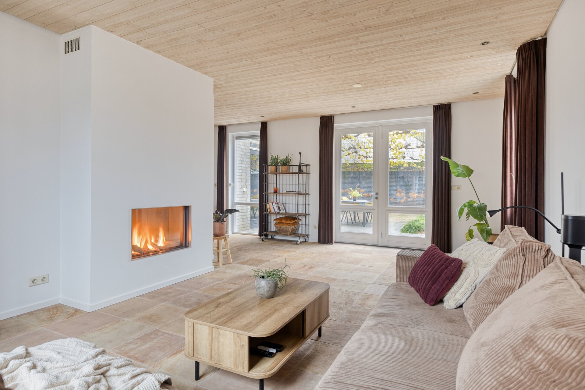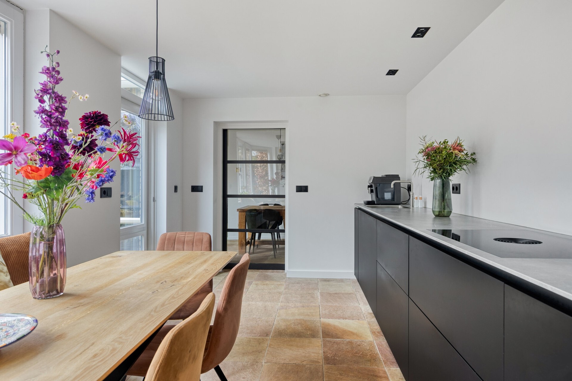 De woonkamer beschikt over openslaande tuindeuren, een sfeervolle gaskachel en het is een fijne ruimte met uitzicht op de tuin. In de woonkamer en keuken ligt vloerverwarming. Verder is vanuit de woonkamer de kelder te bereiken met voldoende opslagruimte. De keuken is in 2021 gemoderniseerd en er zijn nieuwe raamkozijnen geplaatste inclusief screens. Het plafond en de wanden zijn strak gestukt. De keuken is voorzien van luxe inbouwapparatuur van Miele zoals een koelkast, vriezer, grote spoelbak, oven, vaatwasmachine, quooker en een Bora kookplaat /afzuiging. Vanuit de keuken kom je in de inpandige garage en berging. De tuin is bereikbaar via de keuken.