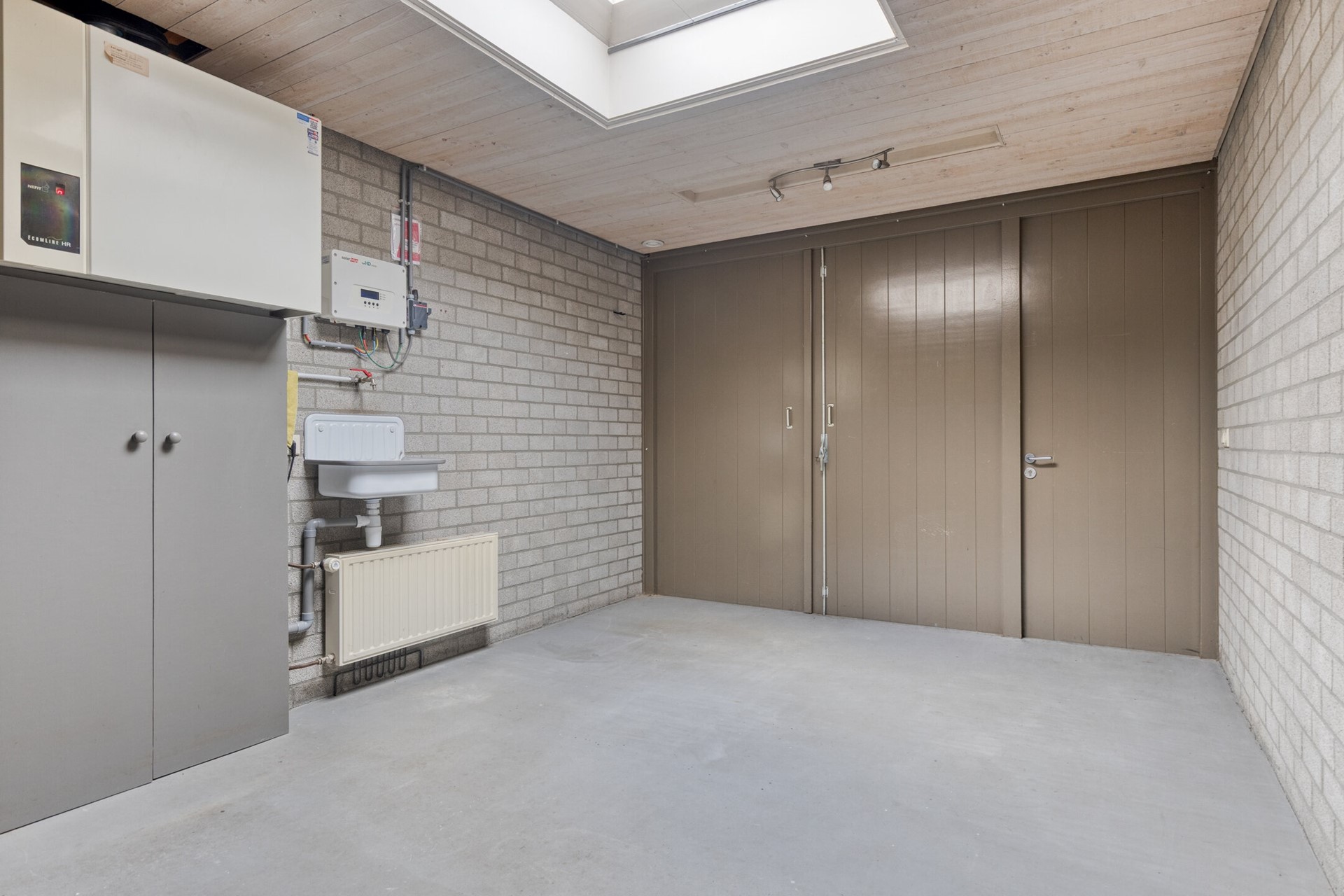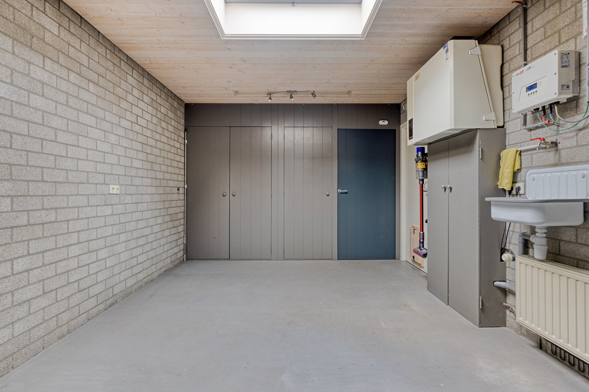 Via de oprit met carport en de keuken is er toegang naar de garage. Een ideale ruimte voor extra opbergruimte of bijvoorbeeld een chill-ruimte voor de kinderen. De CV ketel hangt hier en er is een extra uitstortgootsteen. Aansluitend is er nog een extra ruimte met inbouwkasten en de mogelijkheid voor de berging van de fietsen of tuin gereedschap. Vanuit hier is er toegang tot de tuin.