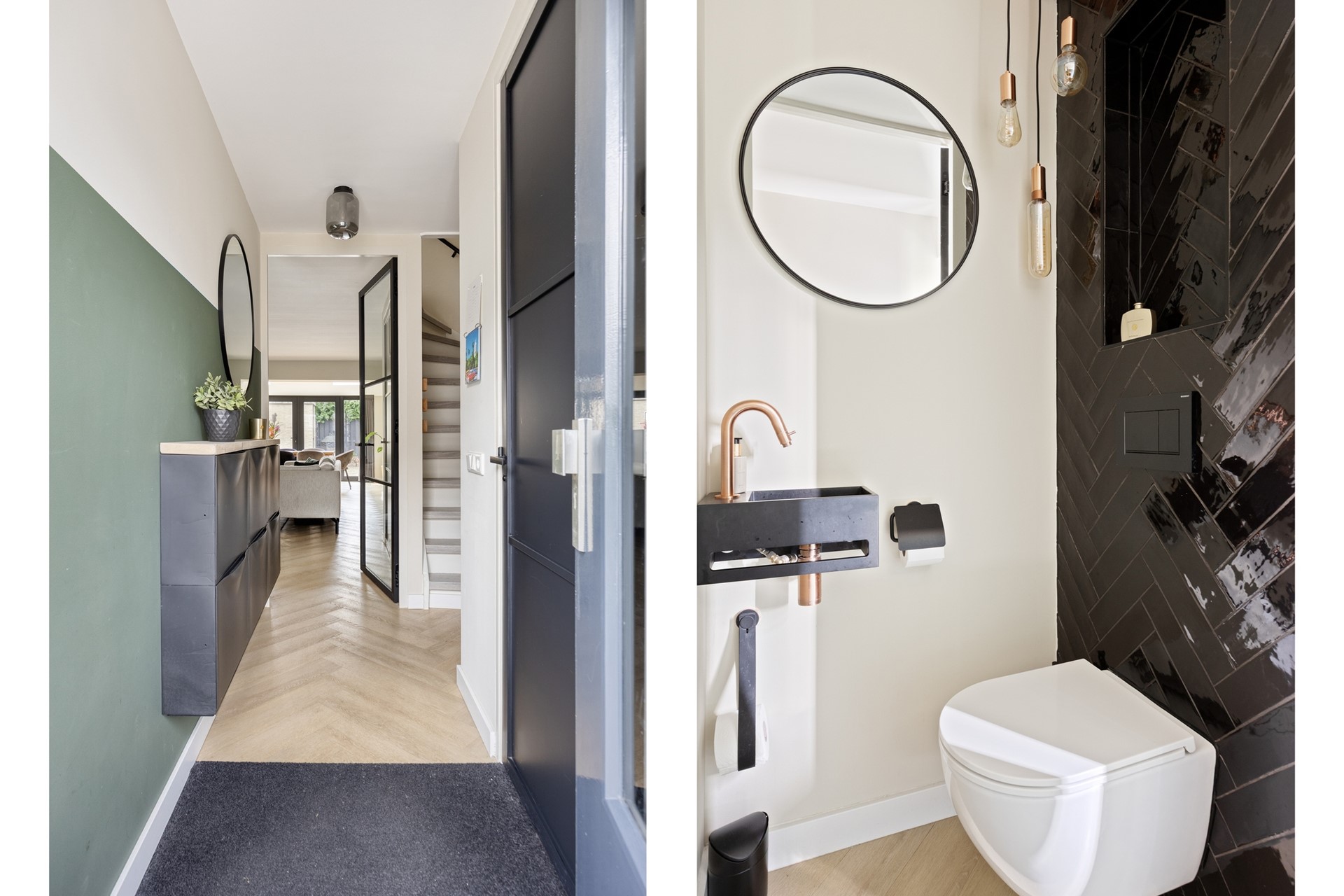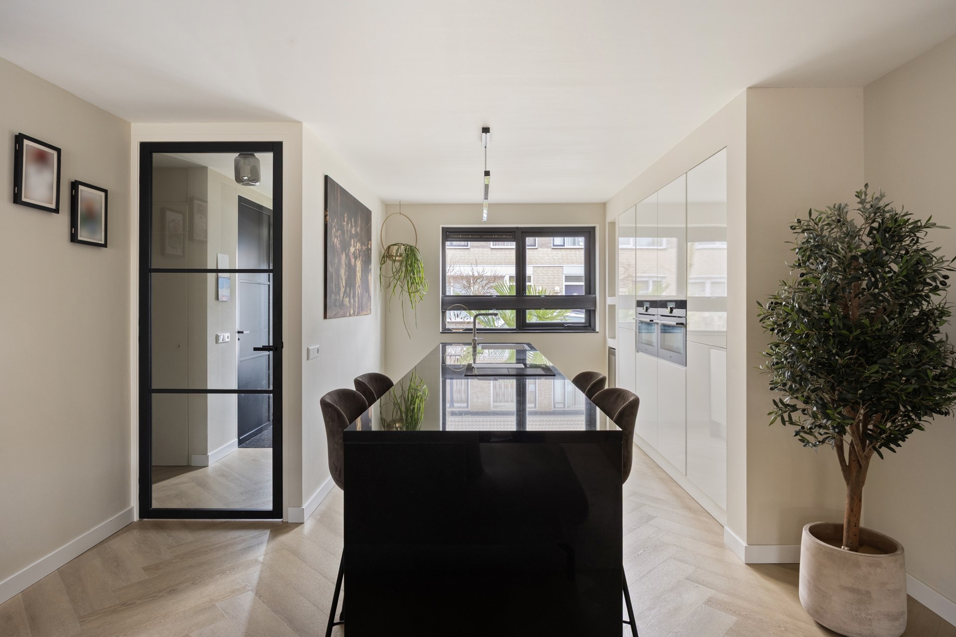 Hal met meterkast en een moderne toiletruimte. Bij binnenkomst in de leefruimte valt direct de ruimte op. Aan de voorzijde van de woning is een moderne keuken met kookeiland gecreëerd met een luxe maatwerk keukeninrichting voorzien van een inductie kookplaat met afzuiging, spoelbak, Franke heet water kraan, zeer ruime koelkast, vrieskast, 2 ovens. Het eiland loopt door tot een bar, waar plek is voor vier krukken. Hier kun je gezellig een drankje of kopje koffie aan nuttigen.