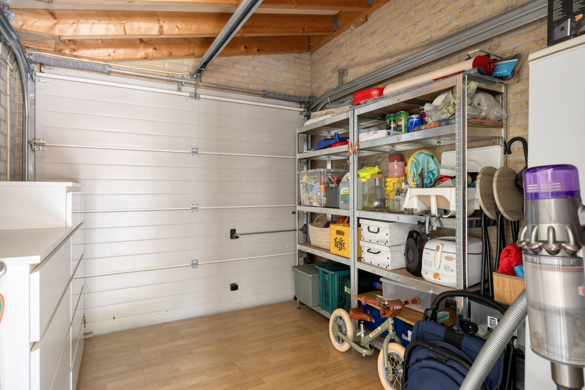 Aan de zijkant van de woning hebben de huidige bewoners een gedeelte van de garage bij de leefruimte getrokken. Hierdoor is een heerlijke bonusruimte ontstaan. Deze is nu in gebruik als speelkamer voor de kinderen en kantoor. Vanuit deze ruimte is de garage te bereiken. Ideaal voor extra opbergruimte.